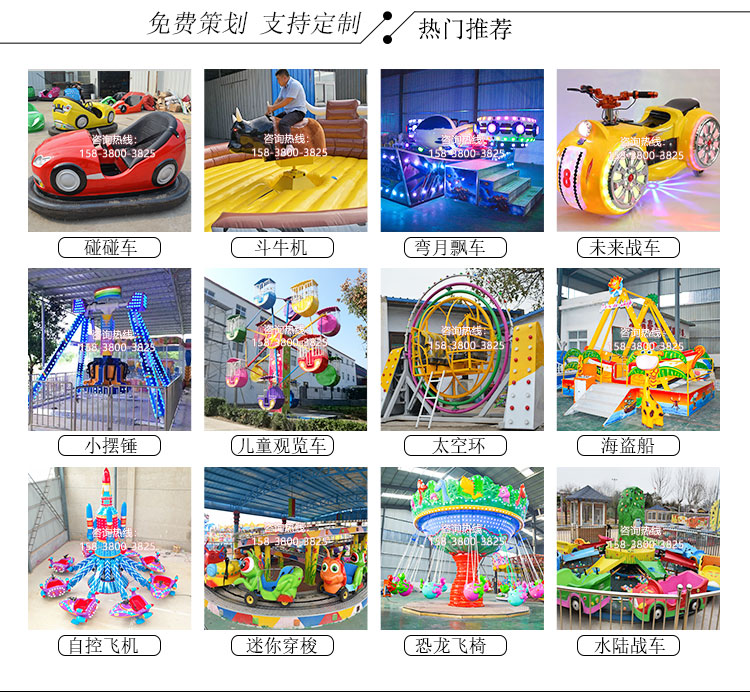 公司主要生产机械类游乐设备包括:观缆车类、滑行车类、架空游览类、陀螺类、飞行塔类、转马类、自控飞机类、小火车类、碰碰车类、观光车类等其中包含(神州飞碟、迪斯科转盘、袋鼠跳、旋转咖啡杯、弯月飘车、迷你穿梭、滑行龙、大章鱼、海盗船、摆锤、星际探险、摇滚排排坐、三维太空环、疯狂骑牛机等众多产品);所有生产产品各项指标均达到国家游乐设备行业制定的质量标准。