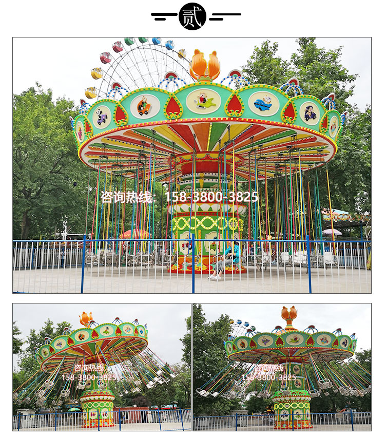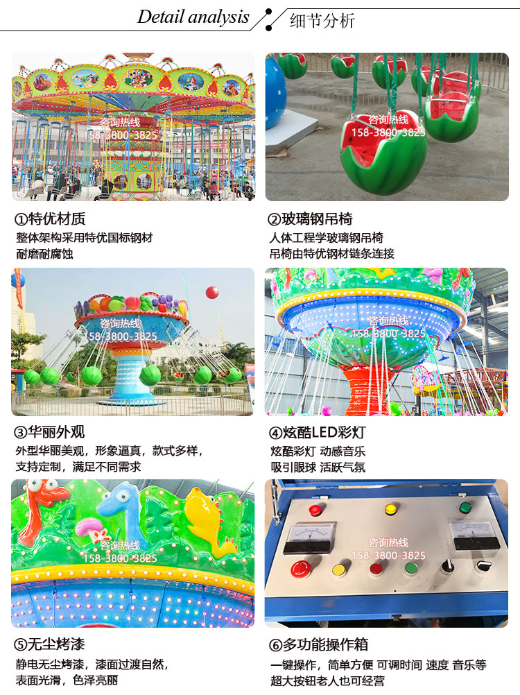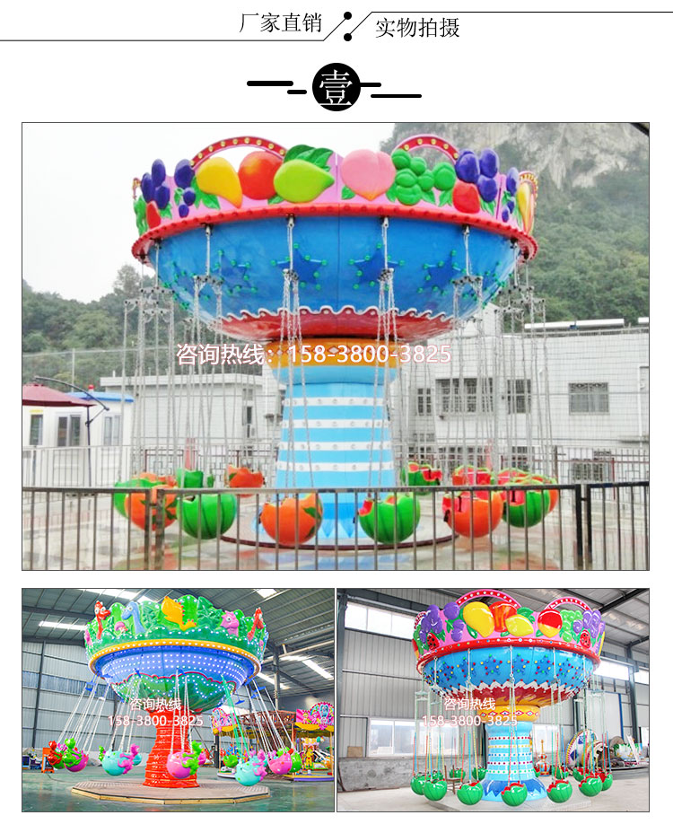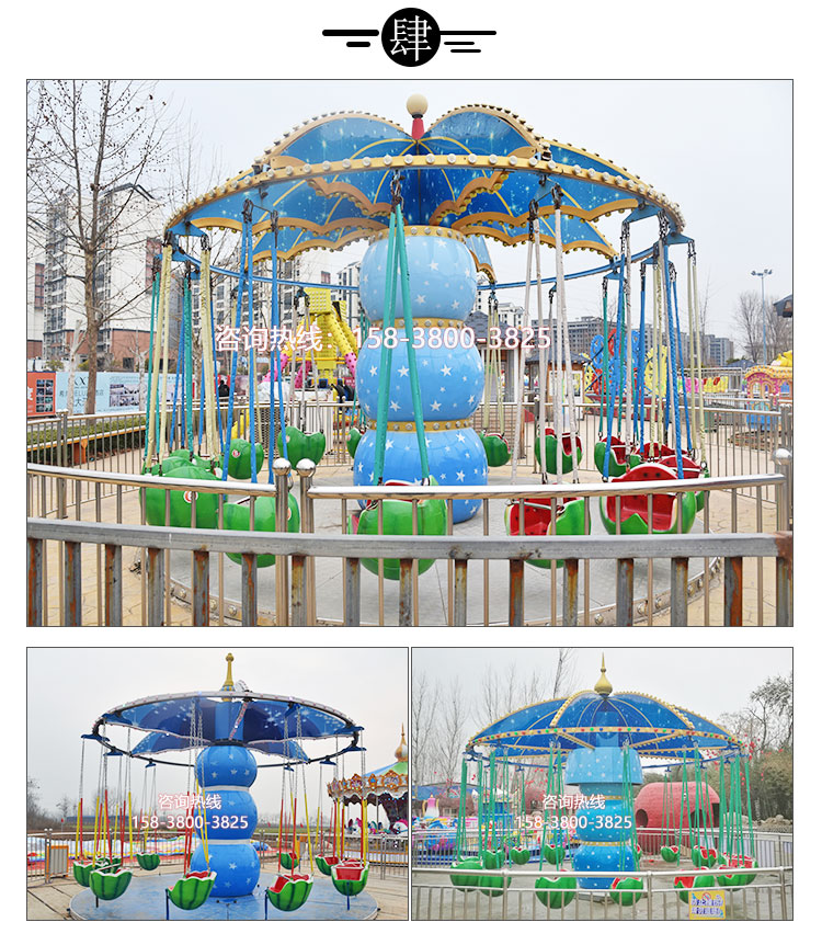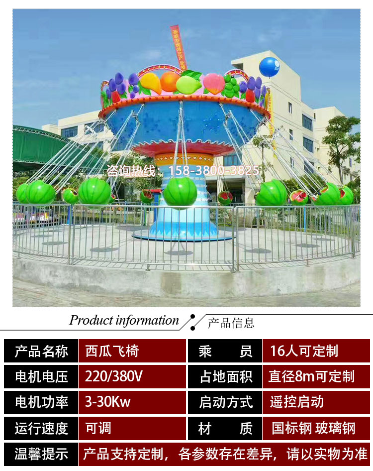 西瓜飞椅是一款新造型旋转水果盘,飞椅座舱清一色的大西瓜,孩子们坐在西瓜座舱的飞椅里,尽情的欢笑,抬起头来,飞椅顶部是一个大大的水果盘,盘子四周摆放着香蕉,苹果,水蜜桃,草莓,蓝莓,大黄梨,桔子,香橙,哈密瓜,杏子,柚子,山竹等等。形象逼真,很受大朋友小朋友喜爱!