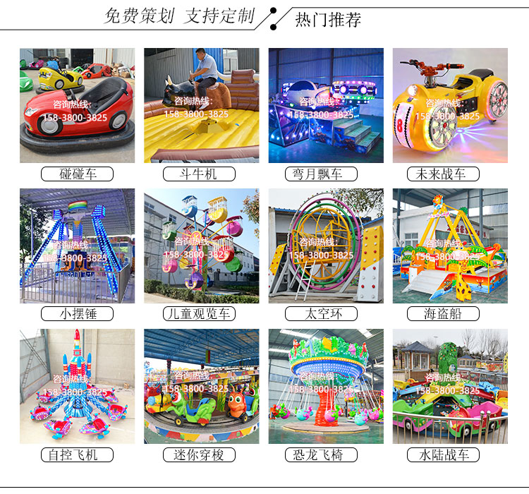 公司主要生产机械类游乐设备包括:观缆车类、滑行车类、架空游览类、陀螺类、飞行塔类、转马类、自控飞机类、小火车类、碰碰车类、观光车类等其中包含(神州飞碟、迪斯科转盘、袋鼠跳、旋转咖啡杯、弯月飘车、迷你穿梭、滑行龙、大章鱼、海盗船、摆锤、星际探险、摇滚排排坐、三维太空环、疯狂骑牛机等众多产品)所有生产产品各项指标均达到国家游乐设备行业制定的质量标准。