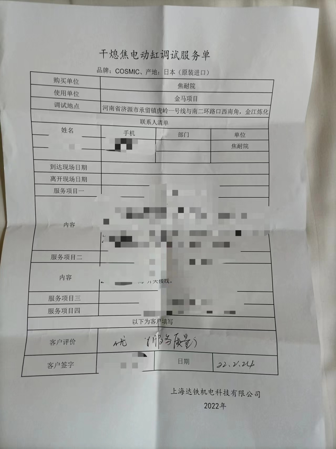 好的售后才是顾客一直信任的源头,上海达铁秉承着”授人以鱼不如授人以渔“的理念,不止是帮顾客维修COSMIC干熄焦循环电动缸,还帮助顾客理解并维修机器,客户对上海达铁的评论是:非常、态度认真。顾客的认可一直以来都是达铁人的服务宗旨。
