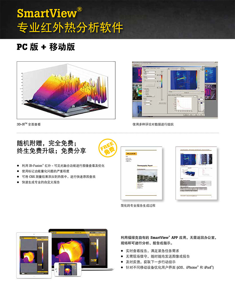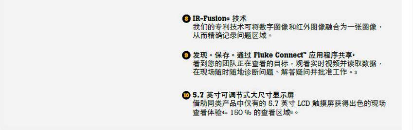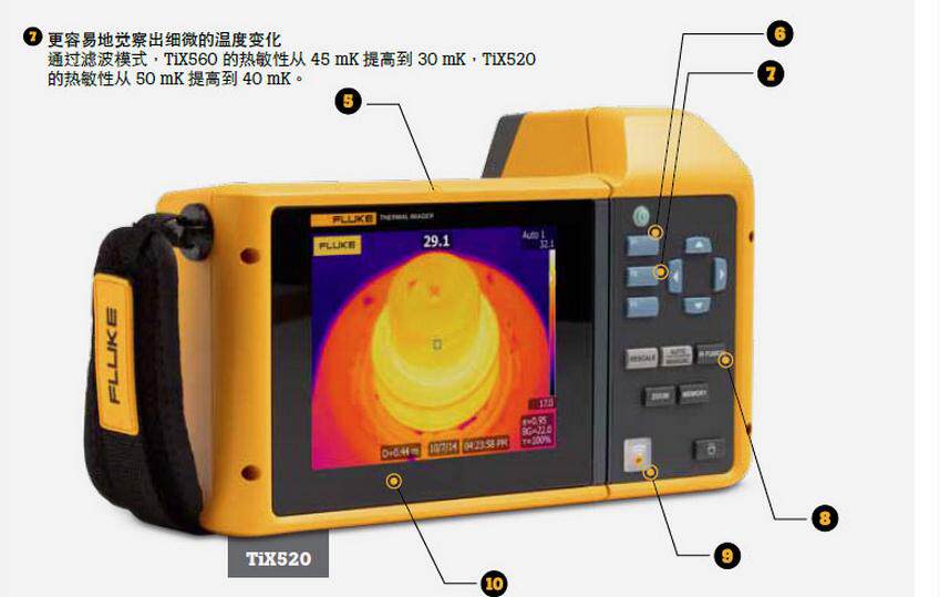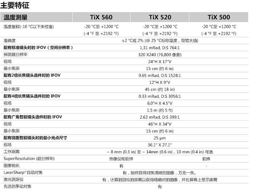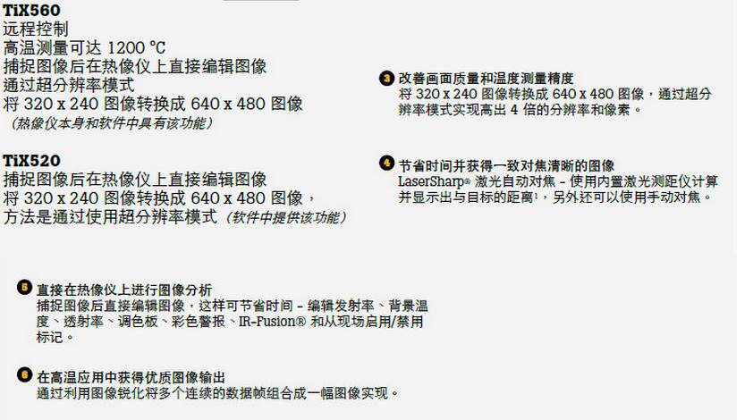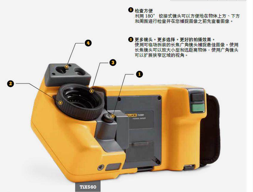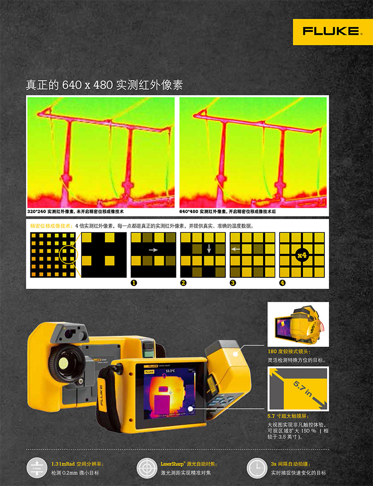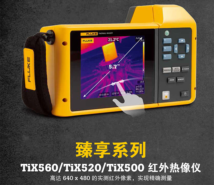 福禄克TIX560利用同级别中大的 5.7 英寸感应触摸液晶显示屏带来的现场视觉体验1 - 视野区扩大 150%4图像质量和温度测量精度提高 - 将您的 320x240 图像转换成 640x480 图像,通过精密位移成像技术实现 4 倍的分辨率和像素(在热像仪上)LaserSharp 自动对焦,为福绿克拥有,利用其内置激光测距仪以2 计算并显示与目标2 之间的距离