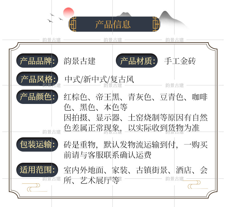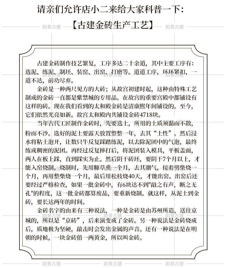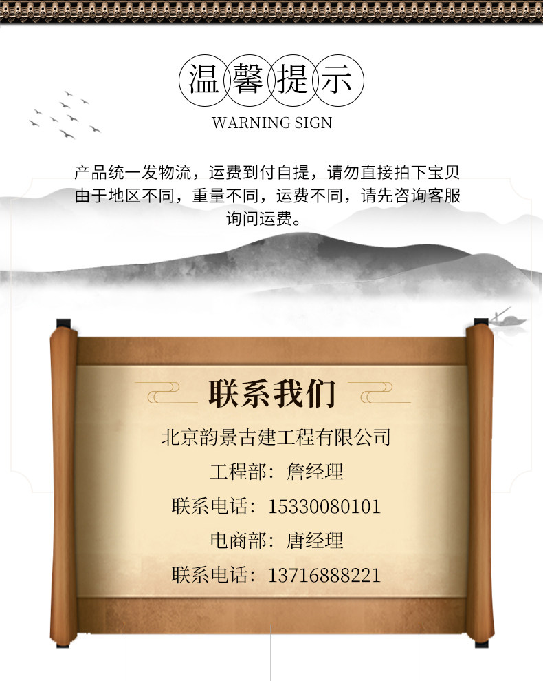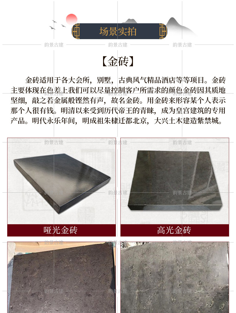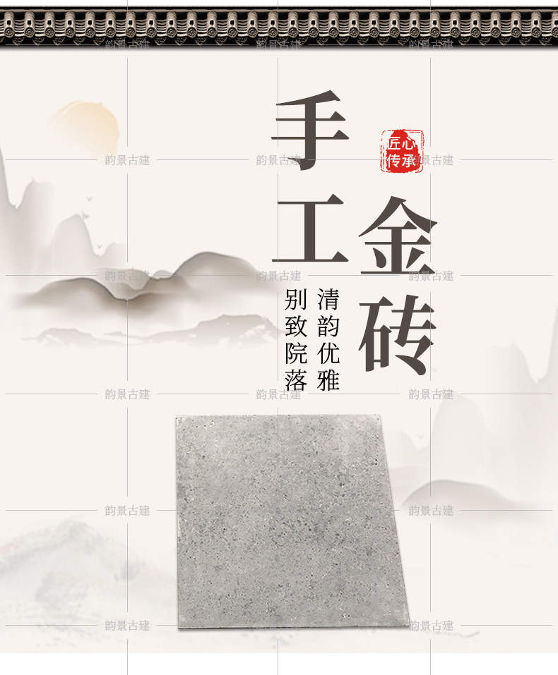 北京韵景古建公司是集传统中式和现代中式砖瓦材料 青砖异形加工及纯手工青砖雕刻产供销一体化的厂商 公司坐落于古都北京 依托北京需求旺盛的古建材和仿古建材市场面向全国市场 本着传承中国建筑文化 弘扬中式美学精髓的宗旨 从传统经典到中式仿古的审美角度出发 开发了一大批适应市场希求的高品味 高质量产品 瞄准了这个正在日益壮大的中式风格建筑装饰材料市场 满足了广大中式建筑爱好者的需求 并受到他们的一致认可 公司产品主要有:各种规格仿古面砖、砍磨砖、庭院砖、城砖、曼地金砖、机制地面方砖......内容丰富题材多样的纯手工砖雕 各种墙体 门套 窗套 台面等重要局部装饰的异形青砖深度精加工 各种栏杆 门墩 抱鼓石定制加工 青瓦 琉璃瓦及相关配件等丰富的砖 瓦 石一系列产品 适用于各种古建园林建筑 茶楼 酒店 会馆 博物馆 机关单位 露天景观等文化场所 专业 的营销定位让客户少跑场地节省时间 又提高了工作效益 从而增强了客户对本公司的忠诚度 感谢您对本公司产品的关注 欢迎广大客户前来参观指导相信您对中式建筑也有着浓厚的兴趣和深深的喜爱 (亭台楼阁) (小桥流水) 也许您还有更丰富的构思来诠释您内心深处那份古色古香的悠悠情怀 那么韵景古建也许能为实现您的中式美学价值提供一些借鉴和启发