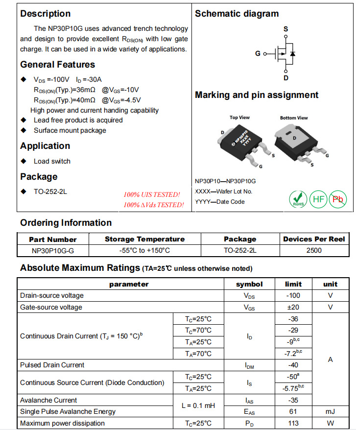 The NP30P10G uses advanced trench technology