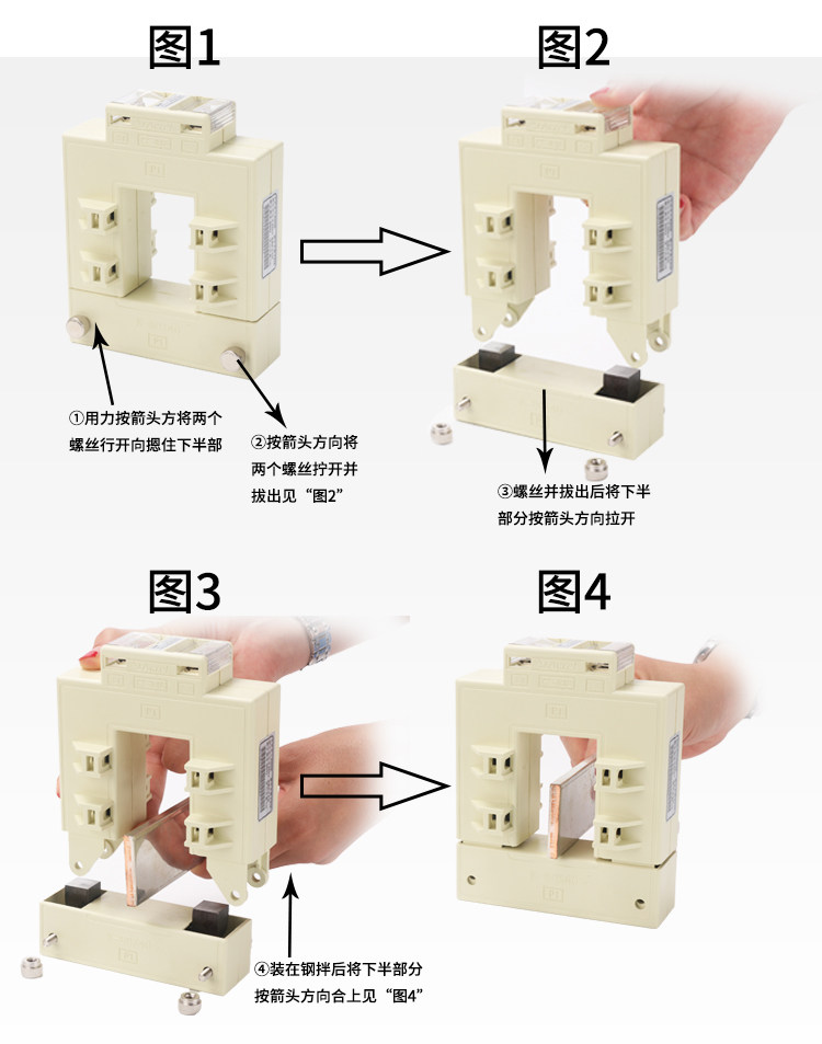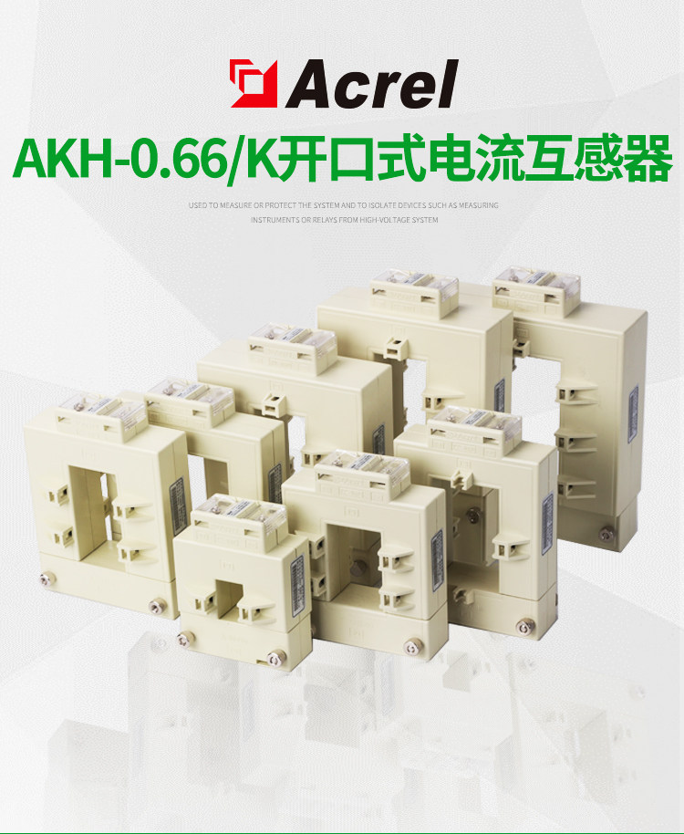 AKH-0.66K型开口式电流互感器主要应用于工业中城网、农网改造项目,安装方便,无须拆次母线,亦可带电操作,不影响客户正常用电,为用户改造项目节省人力、物力、财力,提率。该系列电流互感器可与继电器保护、测量以及计量装置配套使用。
