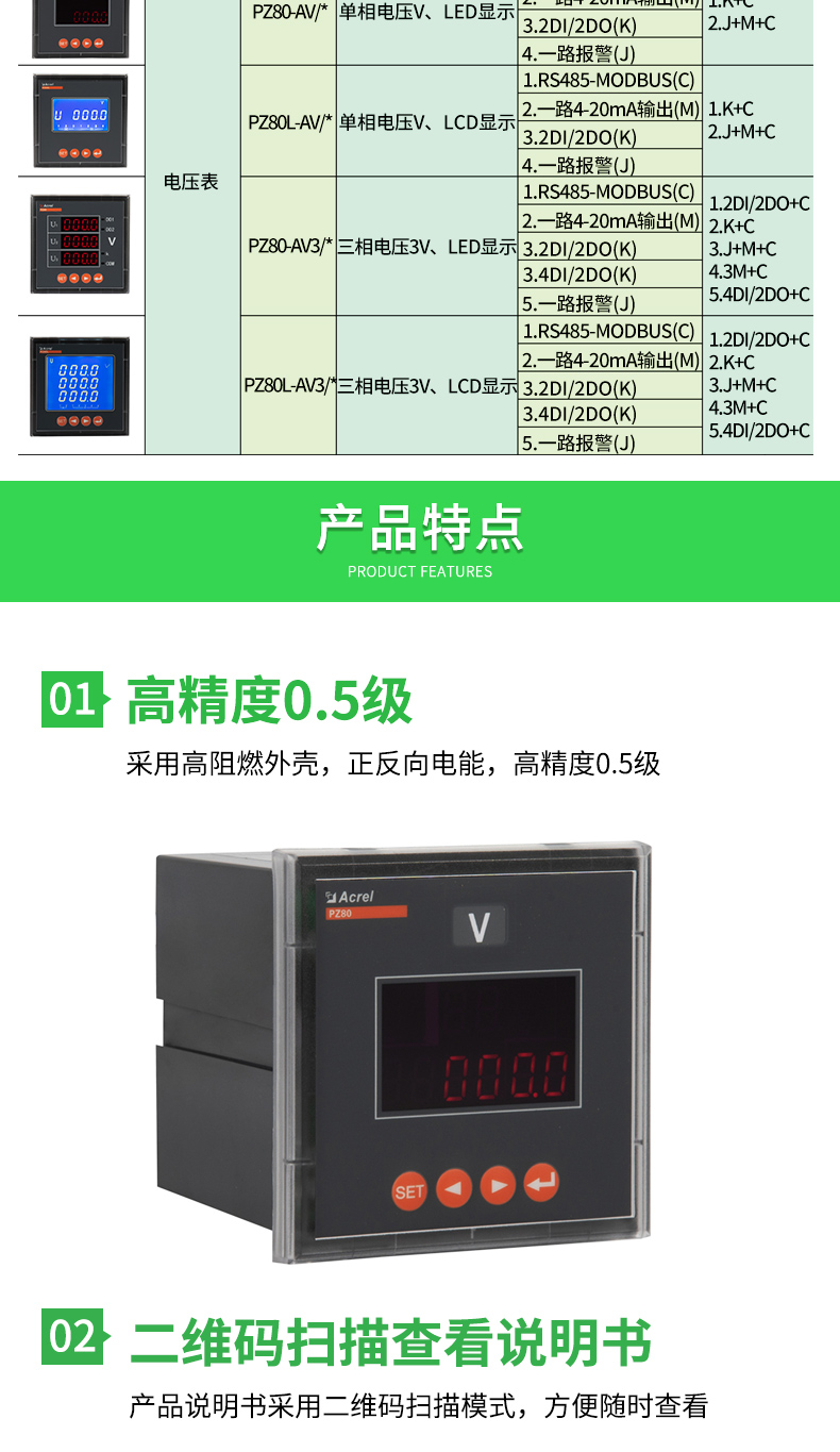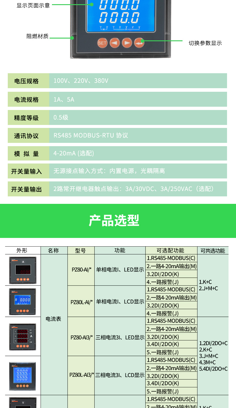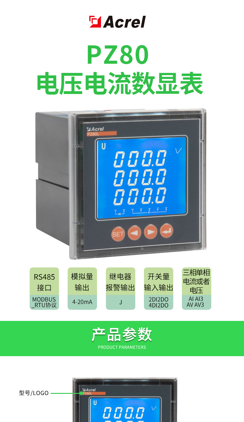 PZ 系列可编程智能电测仪表,是针对电力系统、工矿企业、公用设施、智能大厦的电力监控需求而设计的智能仪表,它集成电力参数的测量(如单相或者三相的电流、电压、有功功率、无功功率、视在功率、频率、功率因数)以及电能监测和考核管理。同时它具有多种外围接口功能可供用户选择:带有RS485通讯接口,采用MODBUS-RTU协议可满足通讯联网管理的需要;4-20mA的模拟量输出可与测量的电参量相对应,满足DCS等接口要求;带开关量输入和继电器输出可实现断路器开关的“遥信”和“遥控”的功能。采用高亮度LED/LCD显示界面,通过按键来实现参数设置和控制,非常适用于实时电力监控系统。可以直接取代常规电力变送器及测量仪表。作为一种智能化、数字化的前端采集元件,该
