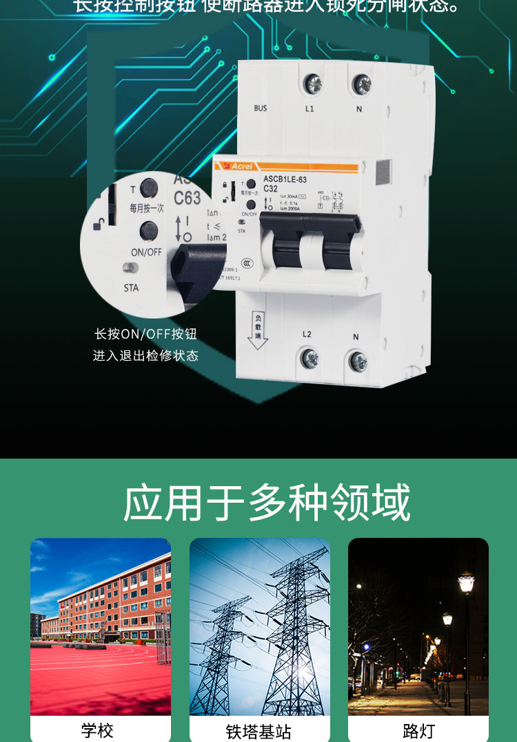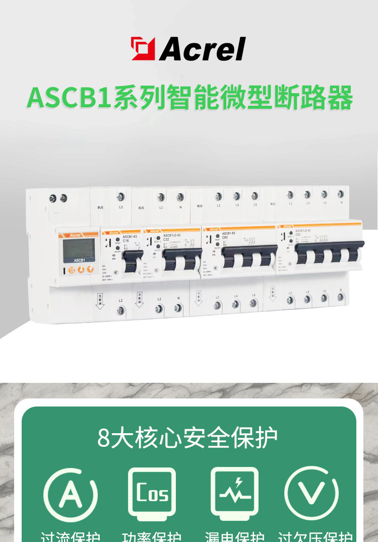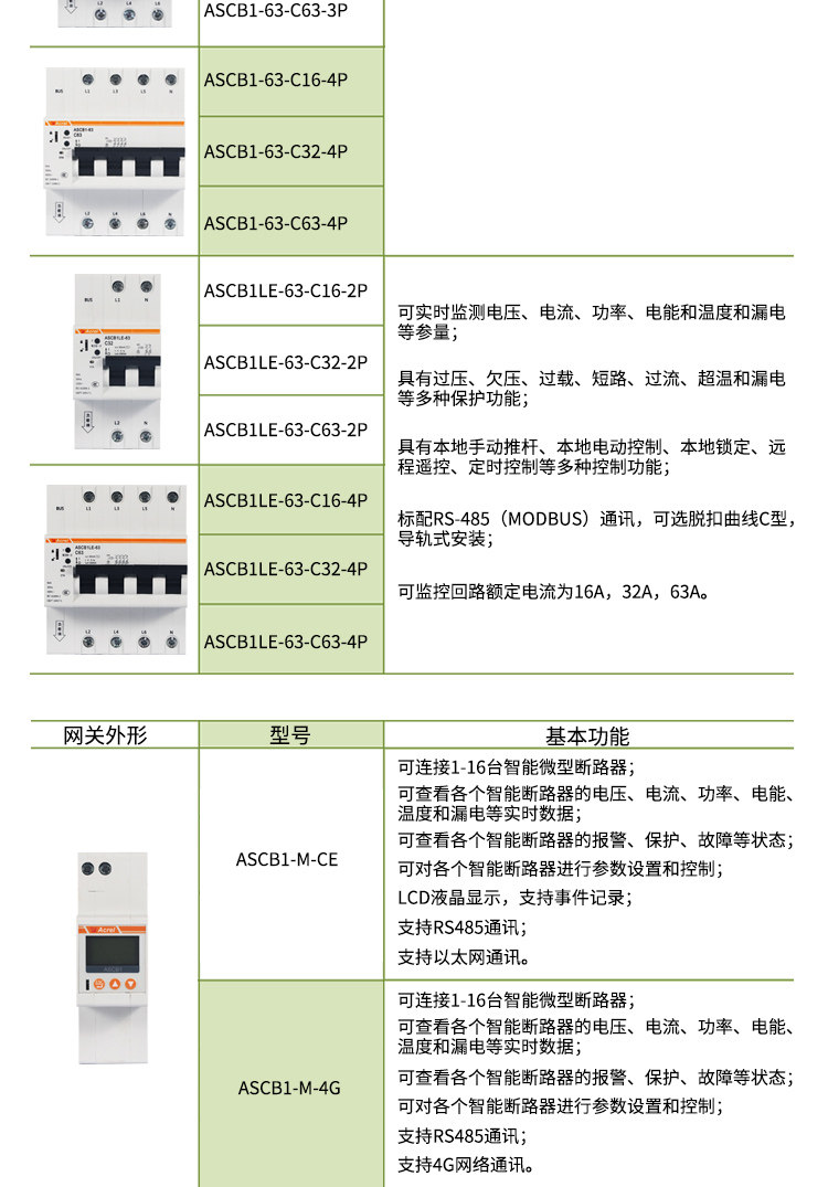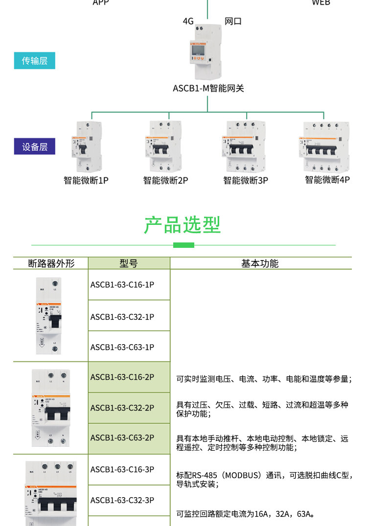 ASCB1系列智能微型断路器(以下简称智能微型断路器)应用于户内建筑物及类似场所的工业、商业、民用建筑及基础设施等领域低压终端配电网络。智能微型断路器配合智能网关使用,对用电线路的关键电气参数,如电压、电流、功率、温度、漏电、能耗等进行实时监测,具有远程操控、异常预警、事故跳闸告警、电能计量统计、故障定位等功能。本系列产品可选单极、2极、3极、4极。
