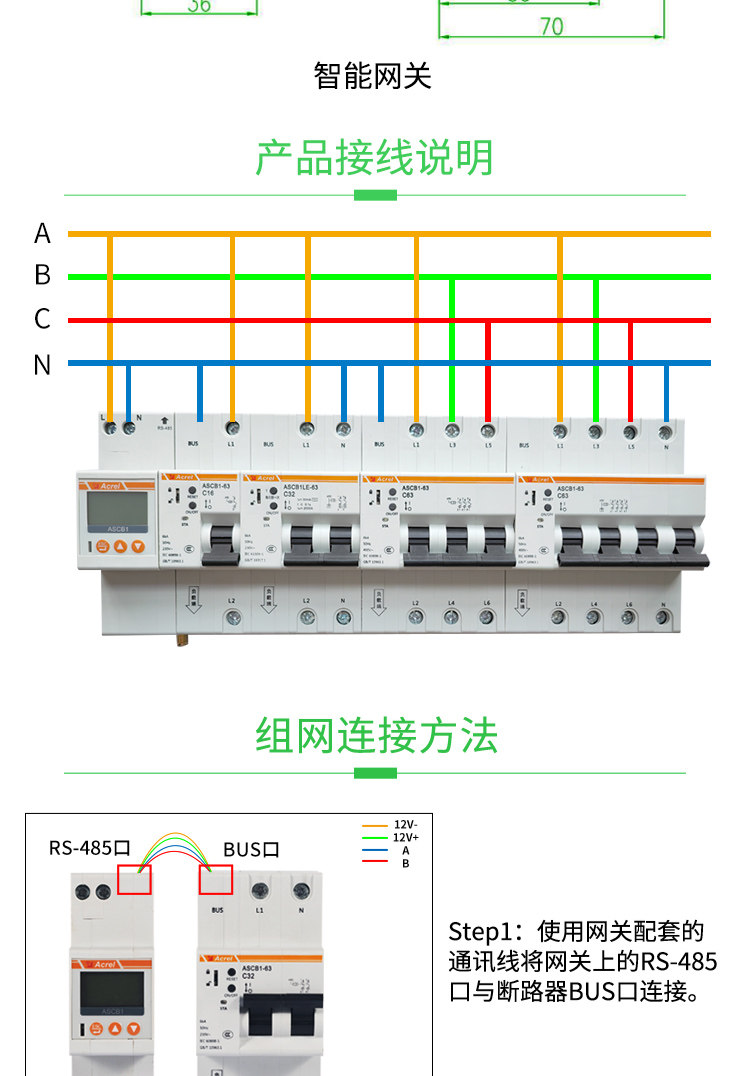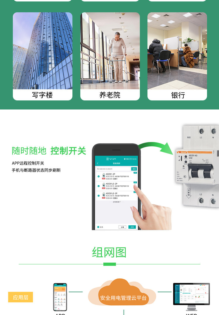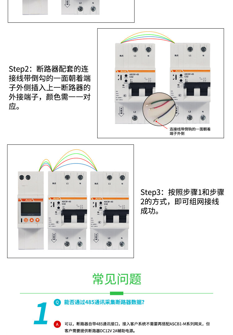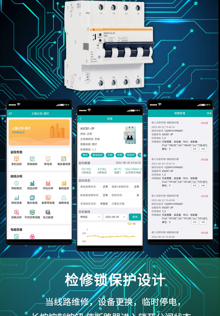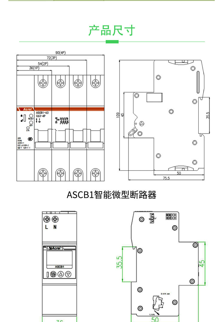 ASCB1系列智能微型断路器(以下简称智能微型断路器)应用于户内建筑物及类似场所的工业、商业、民用建筑及基础设施等领域低压终端配电网络。智能微型断路器配合智能网关使用,对用电线路的关键电气参数,如电压、电流、功率、温度、漏电、能耗等进行实时监测,具有远程操控、异常预警、事故跳闸告警、电能计量统计、故障定位等功能。本系列产品可选单极、2极、3极、4极。