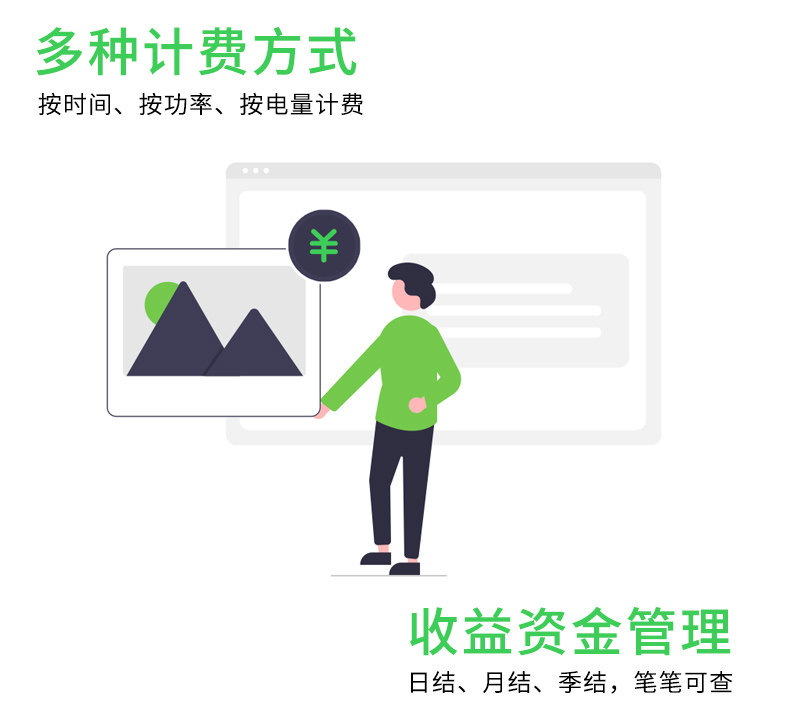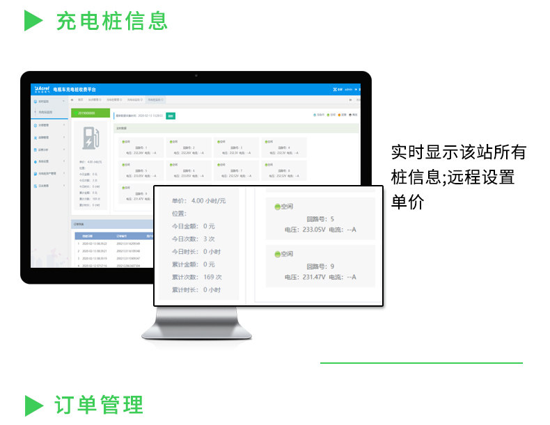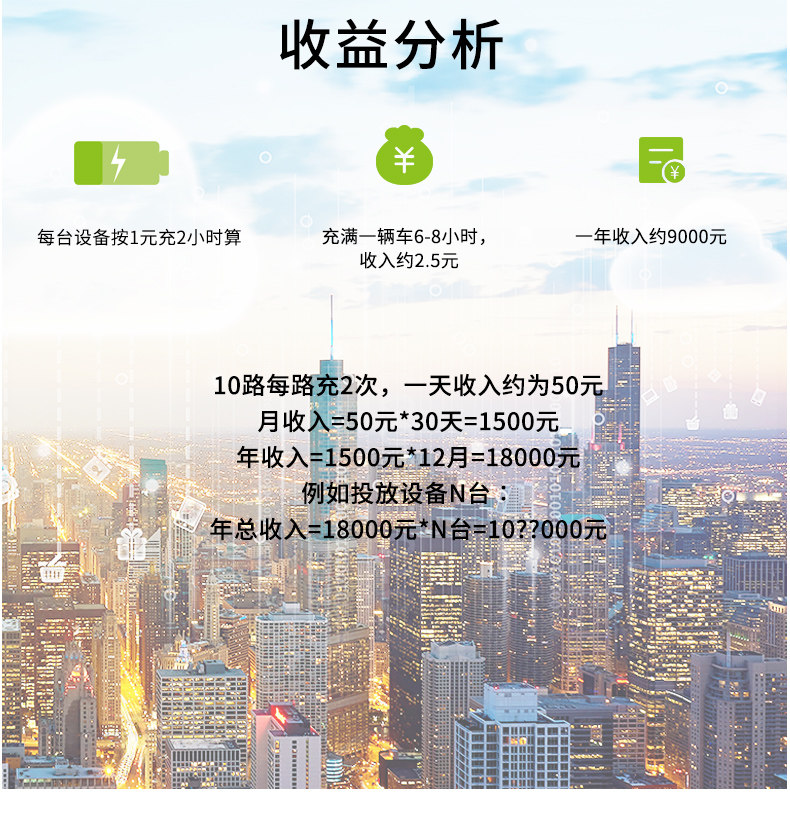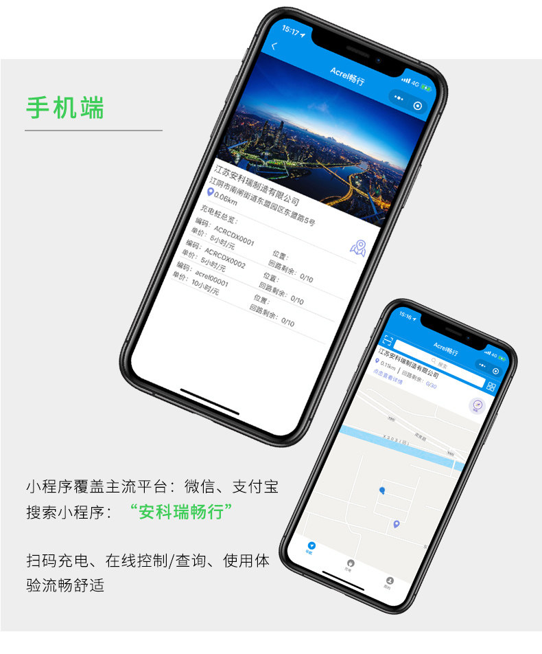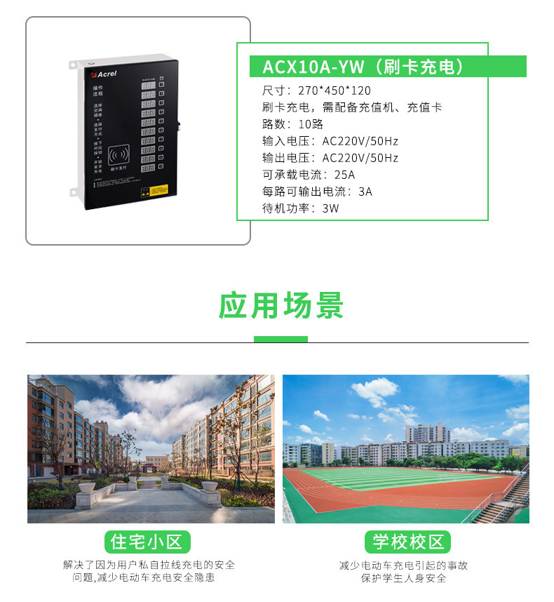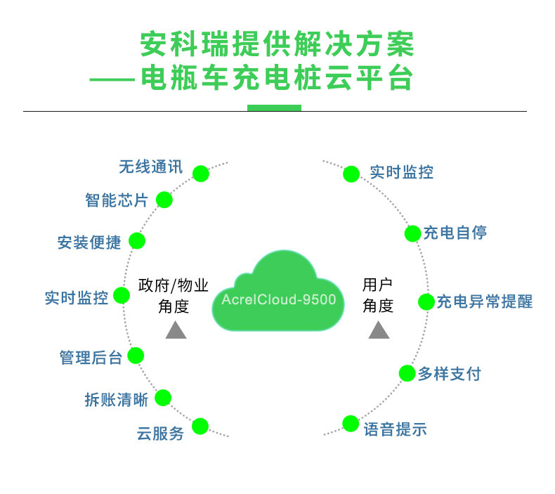 Acrel9500电瓶车充电桩收费运营云平台电瓶车智能充电桩是新一代电动自行车智能充电设备,具有交流输出电源远程通断控制、 充电安全控制、电度计量、按时计费功能于一体的交流供电装置,该装置能通过电动自行车的 车配充电器为电动自行车充电。支付方式可选择投币、刷卡、扫码使用,设备内部可引出 10 路出线至插座,通过电动自行车的车配充电器完成充电。可连接云平台给用户提供安全可 靠及智能化的充电服务。