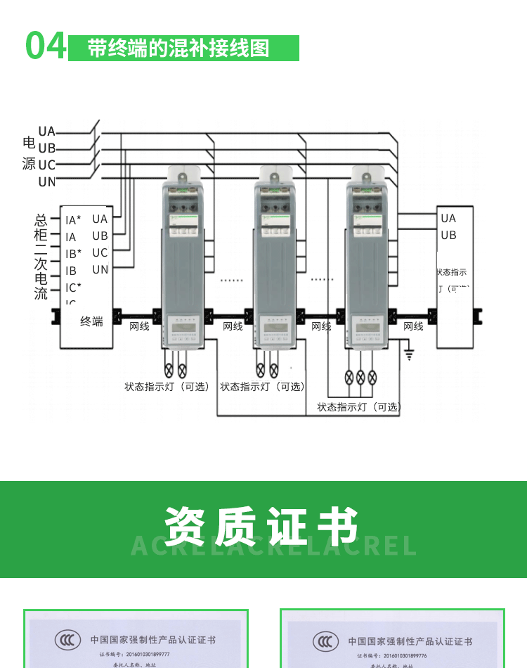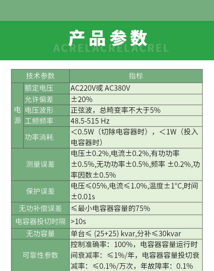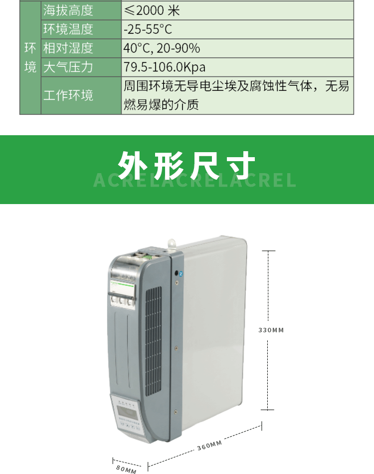 AZC 系列智能电容器采用定式 LCD 液晶显示器,可显示三相母线电压、三相母线电流、三相功率因数、频率、电容器路数及投切状态、有功功率、无功功率、谐波电压总畸变率、电容器温度等。通过内部晶闸管复合开关电路,自动寻找佳投入(切除)点,实现过零投切,具有过压保护、缺相保护、过谐保护、过温保护等保护功能。
