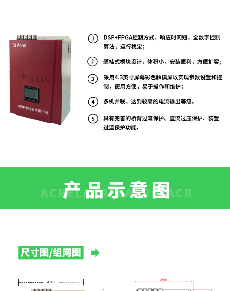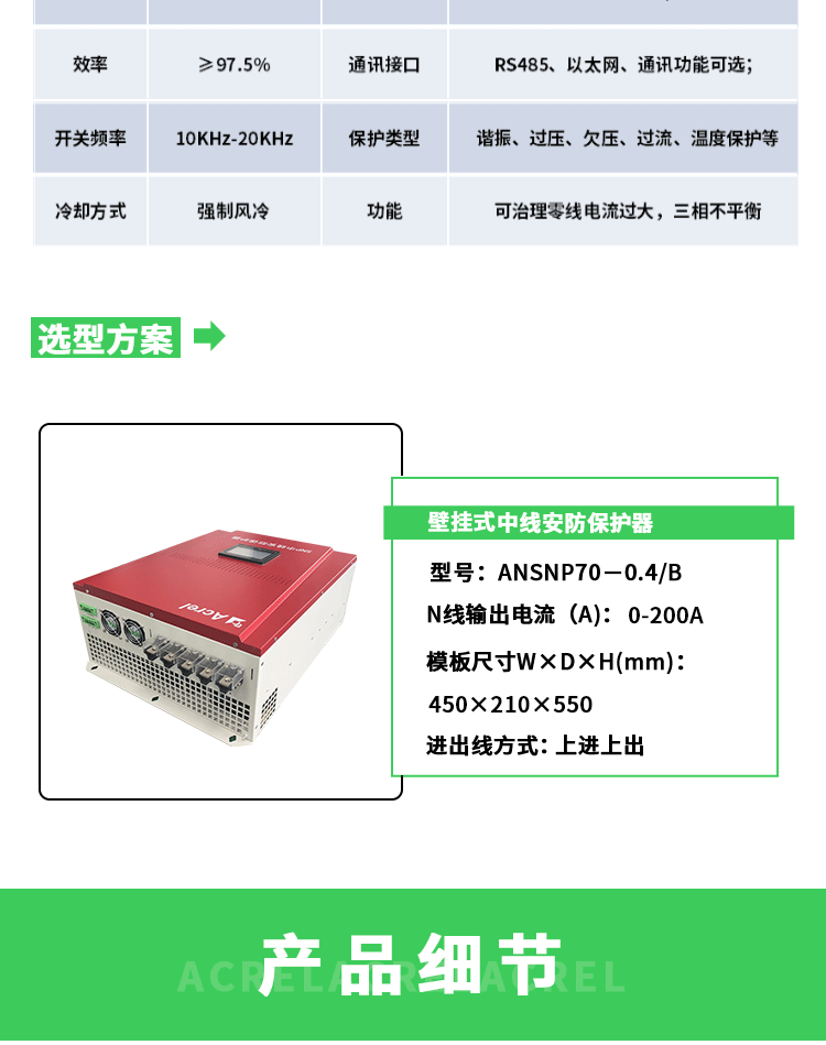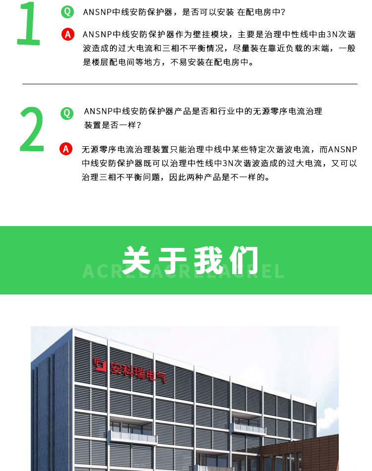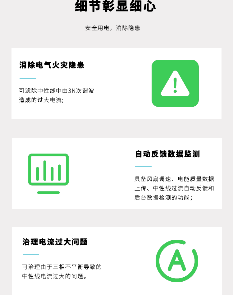 ANSNP 系列中线安防保护器并联在含谐波负载的低压配电系统中,能够对动态变化的谐波电流进行快速实时的跟踪和补偿。中线安防保护器的基本原理为:通过电流检测环节采集系统中性线上过电流信息,经控制器快速计算并提取各次谐波电流的含量,产生谐波电流指令,通过功率执行器件产生与过电流幅值相等方向相反的补偿电流,并注入中性线,从而消除中性线中过大的电流。