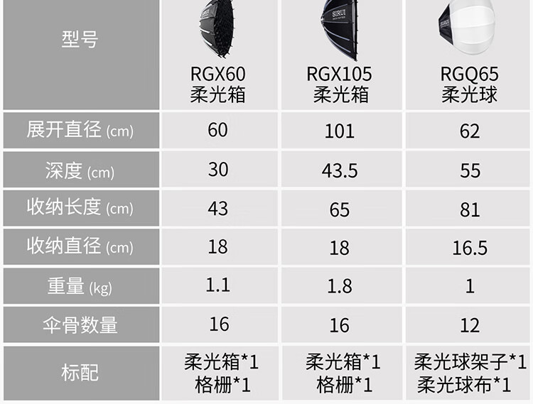 颜色RGX60柔光箱60cm,RGX105柔光箱105cm,RGQ65柔光球65cm