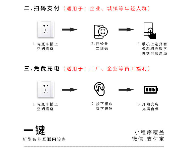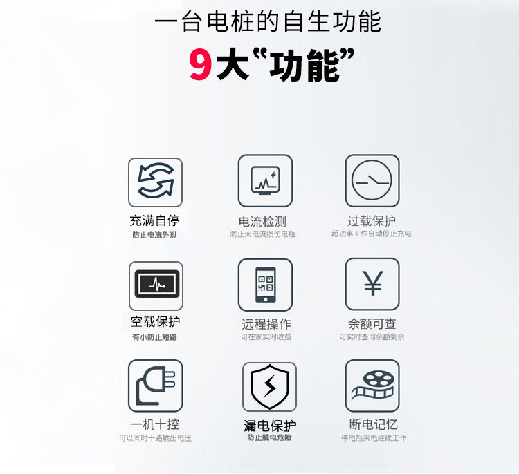 电瓶车智能充电桩是新一代电动自行车智能充电设备,具有交流输出电源远程通断控制、充电安全控制、电度计量、按时计费功能于一体的交流供电装置,该装置能通过电动自行车的车配充电器为电动自行车充电。支付方式可选择投币、刷卡、扫码使用,设备内部可引出 10路出线至插座,通过电动自行车的车配充电器完成充电。可连接云平台给用户提供安全可靠及智能化的充电服务。