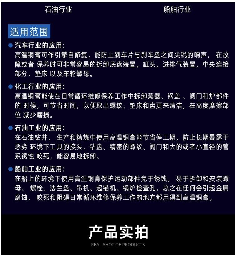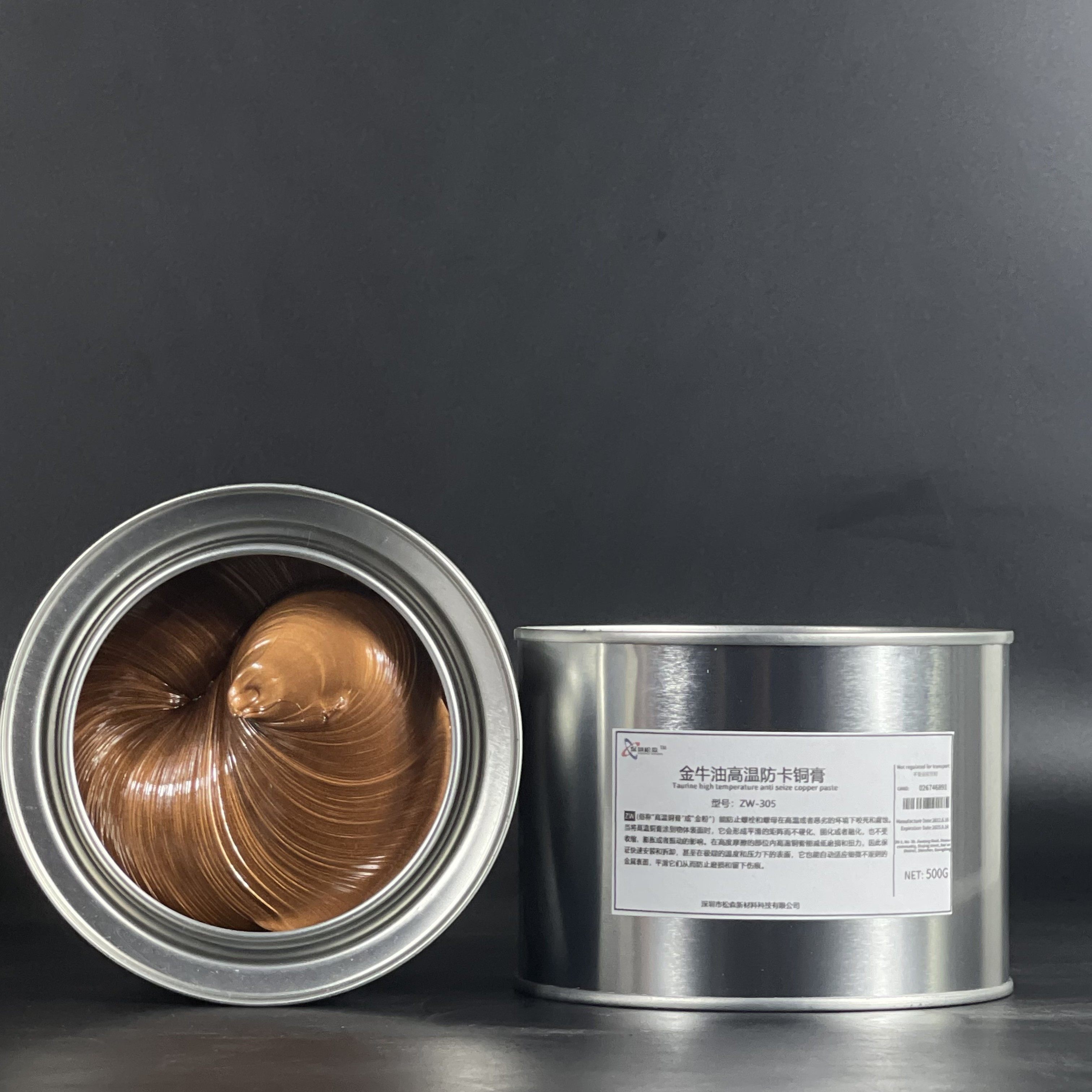 铜防卡膏,金牛油,俗名又叫防紧蚀铜膏,金黄色膏体,内含大量铜微粒子和其他种类的固体润滑剂. 专用于润滑处于高温,高压和腐蚀工况下的标准件,螺丝,螺帽的连接,旋转和拆卸,其拥有非常良好密封特性,能在1100℃高温下防止表面磨损及咬合,其组件长期处于高温或海水侵蚀下仍容易拆卸;防止因高温或长时间操作而造成的硬化、紧蚀和锈蚀。保护螺丝易于装配或确保松拆