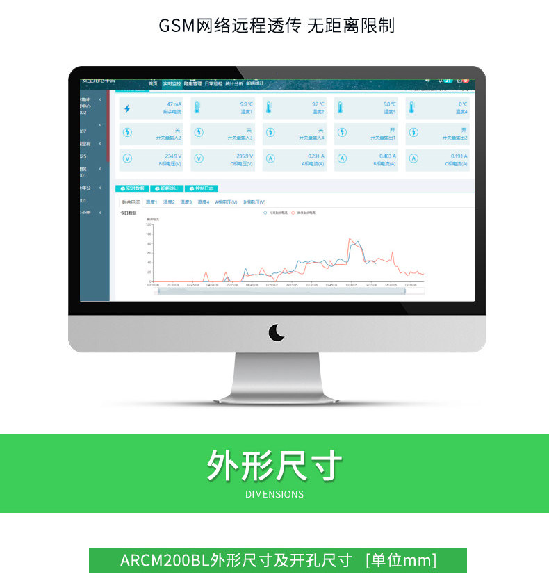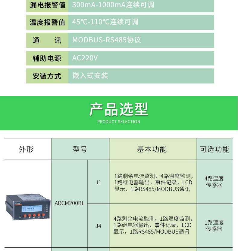 ARCM200BL 型电气火灾监控探测器是针对 0.4kV 以下的 TT、TN 系统设计的,通过对配电回路的剩余电流、导线温度等火灾危险参数实施监控和管理,从而预防电气火灾的发生。