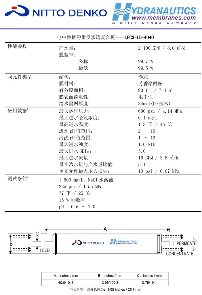 LFC(Low Fouling Composite)膜是美国海德能公司利用卓越的膜技术开发出的低压低污染膜产品,适用于工业废水、城市排水的深度脱盐回用处理。LFC3-LD膜表面 的电荷呈现中性,并且导入亲水性官能团,几乎不受表面活性剂等电荷物质吸附的影响。LFC3-LD还采用了美国海德能公司最新推出的“LD技术”,即抗菌 性34mil 进水隔网技术。新LD技术采用HYDRAblockTM技术对进水隔网进行了革新性的设计,采用不同于传统隔网的结构和材质,大幅提高了反渗透膜元件的抗生物污染性能,确保反渗透系统运行更稳定。