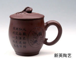 新英 陶艺*宜兴紫砂茶壶*刻字金鱼杯