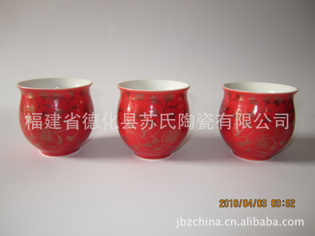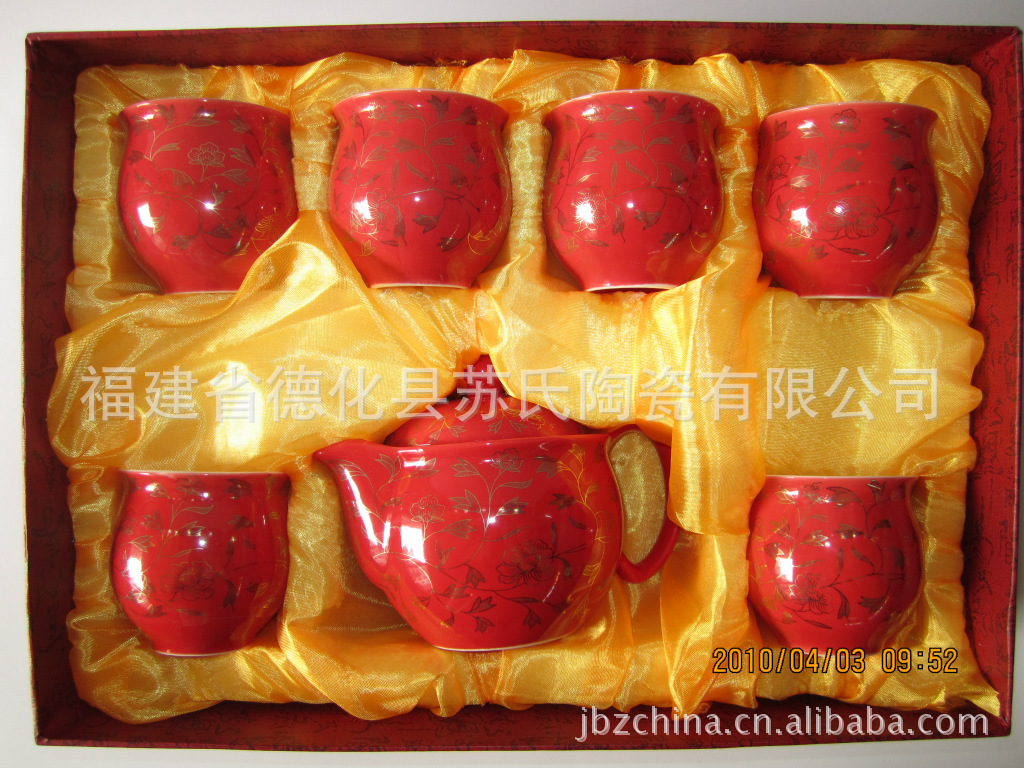 7头红釉金叶子茶具 双层杯茶具套装 茶具批发