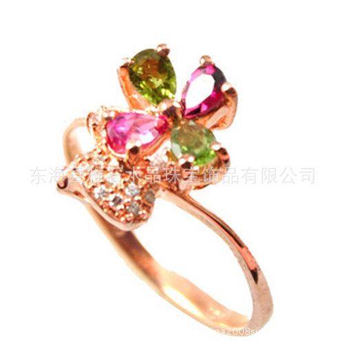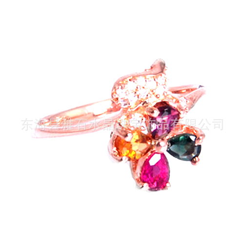 925银镀玫瑰金天然碧玺四瓣花语镶水钻戒指