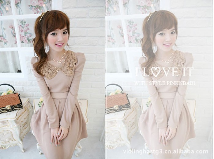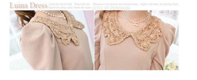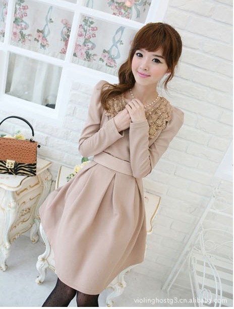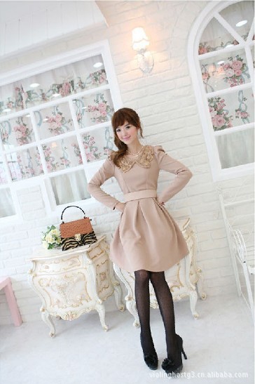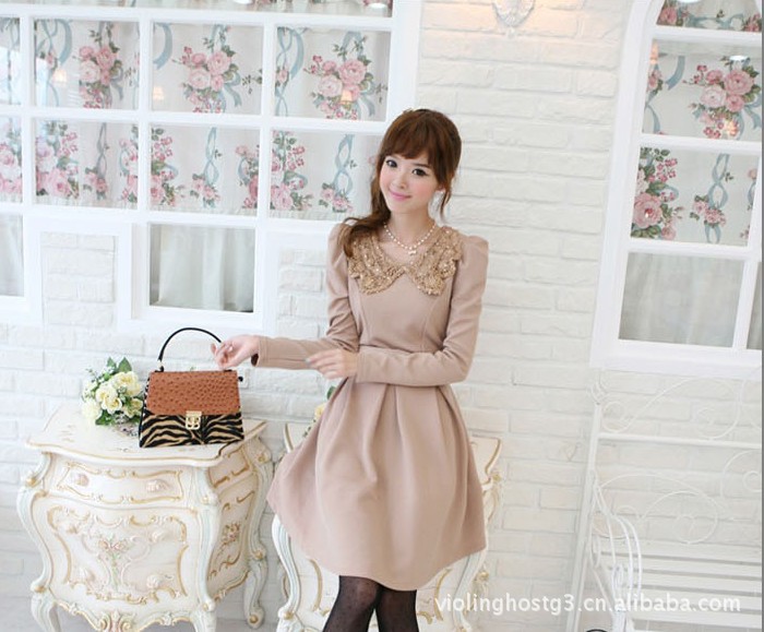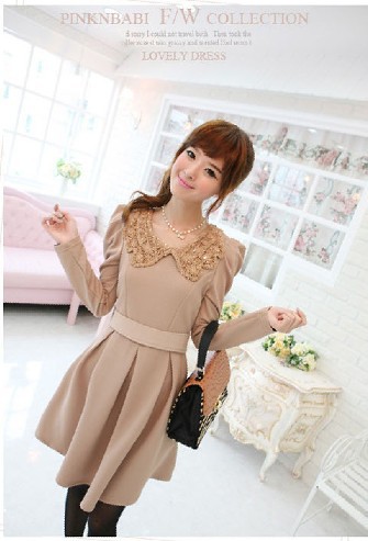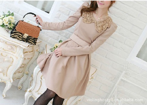 E5253 韩版女装秋冬爆款 亮片钩花翻领 泡泡袖修身连衣裙