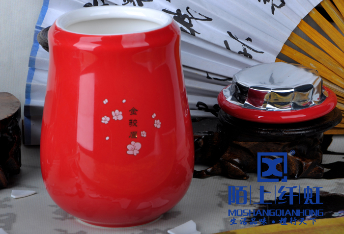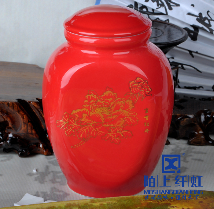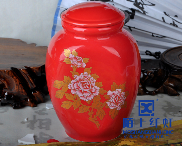 红釉茶叶罐(金牡丹)/ 密封罐/ 普洱/ 陶瓷茶叶罐
