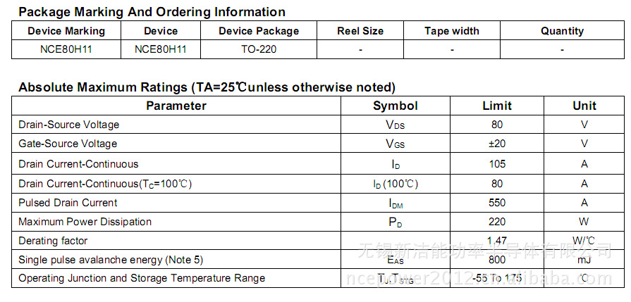 原厂供应NCE80H11 MOS管场效应管 80V/110A