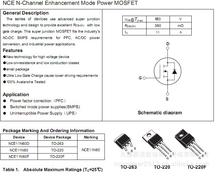 原厂供应超结MOS管 场效应管NCE20N60 600V/20A