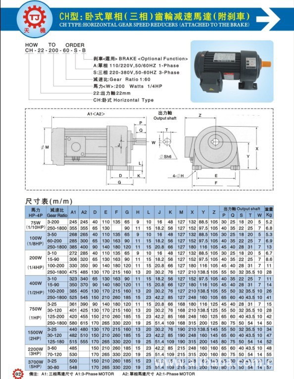 东莞台机减速机TJ-CH卧式单相(三相)齿轮减速机(附刹车)