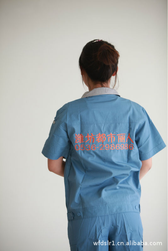 厂家大量供应纯棉细珠帆短袖套装蓝色工作服