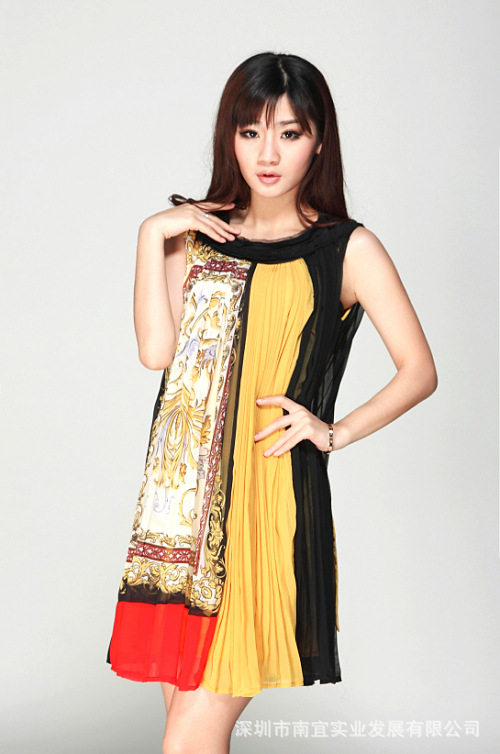 欧美女装 厂价批发 2012 新款时尚春装拼色大摆连衣裙12221