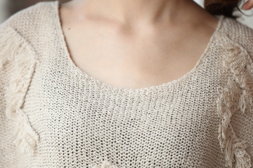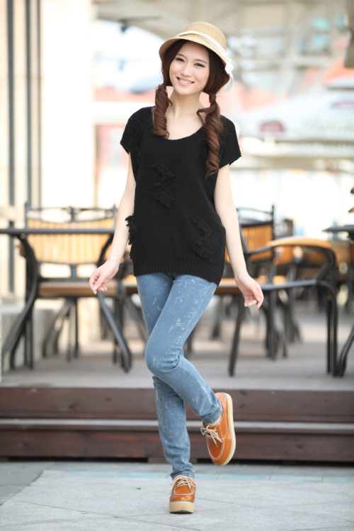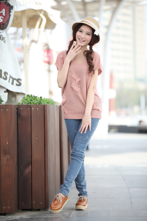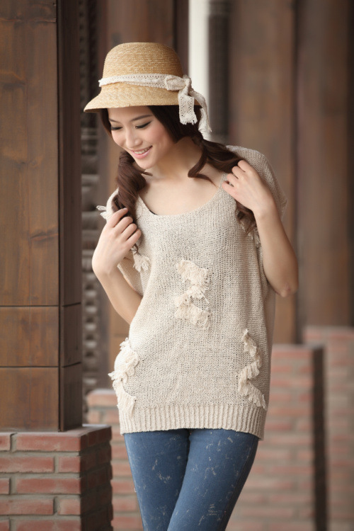 2012春夏新款宽松大码曲珠麻Z形贴纱小短袖针织罩衫批发QA012