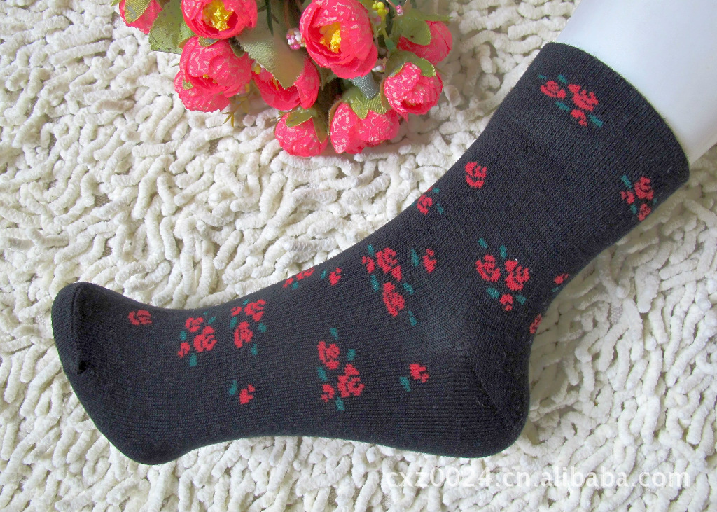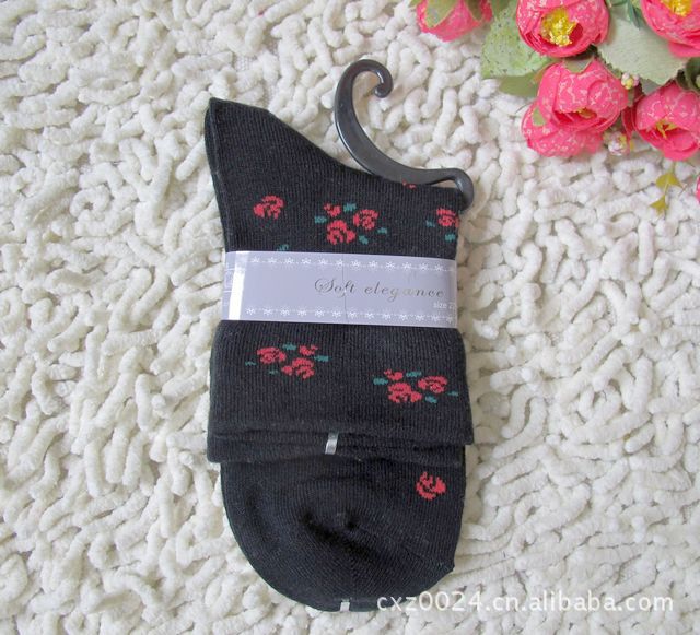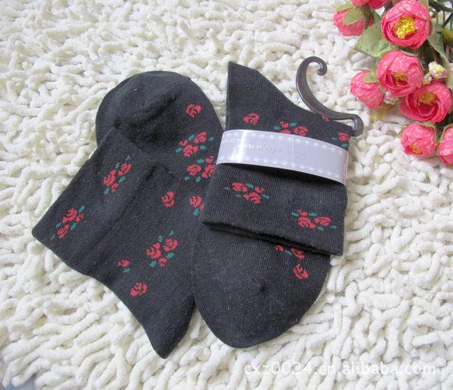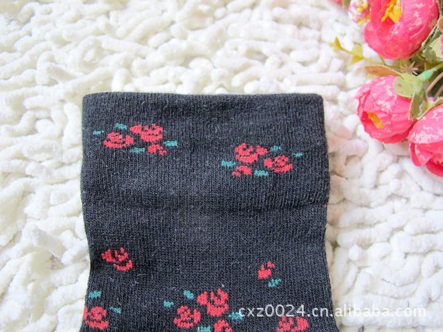 外贸袜子批发 玫瑰花朵图案 黑色 女士短袜 休闲袜 袜子 松口袜