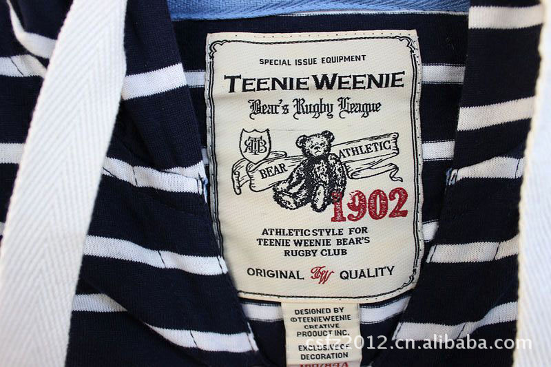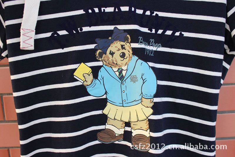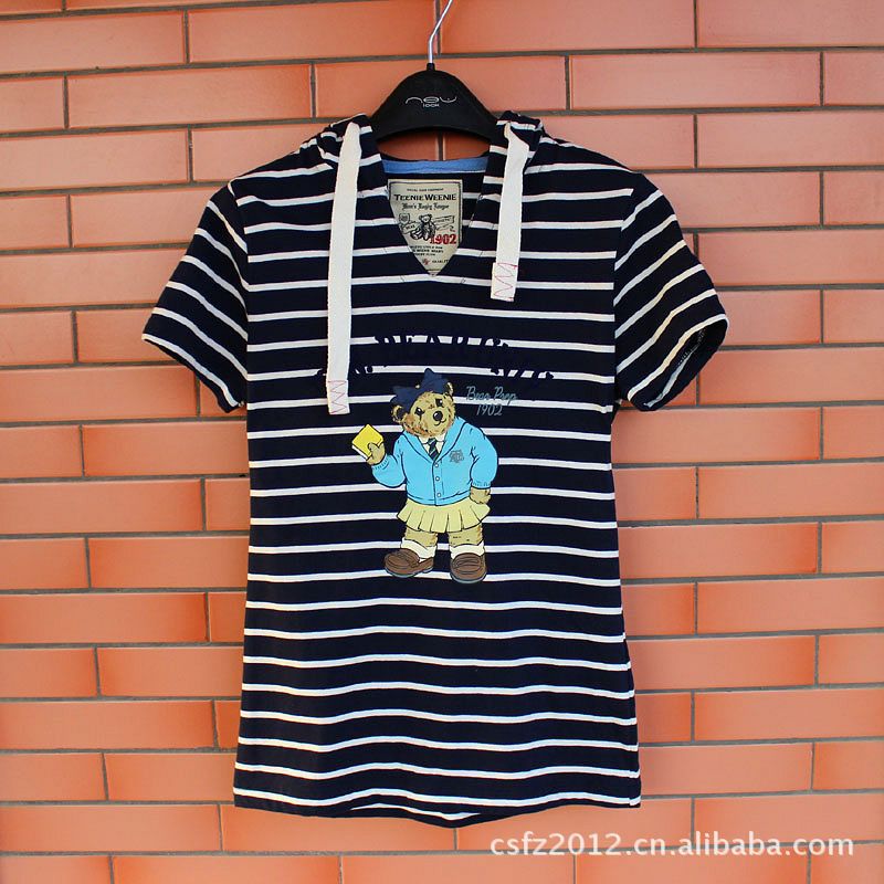 小熊维米带帽蓝白条纹短袖全棉T恤可爱