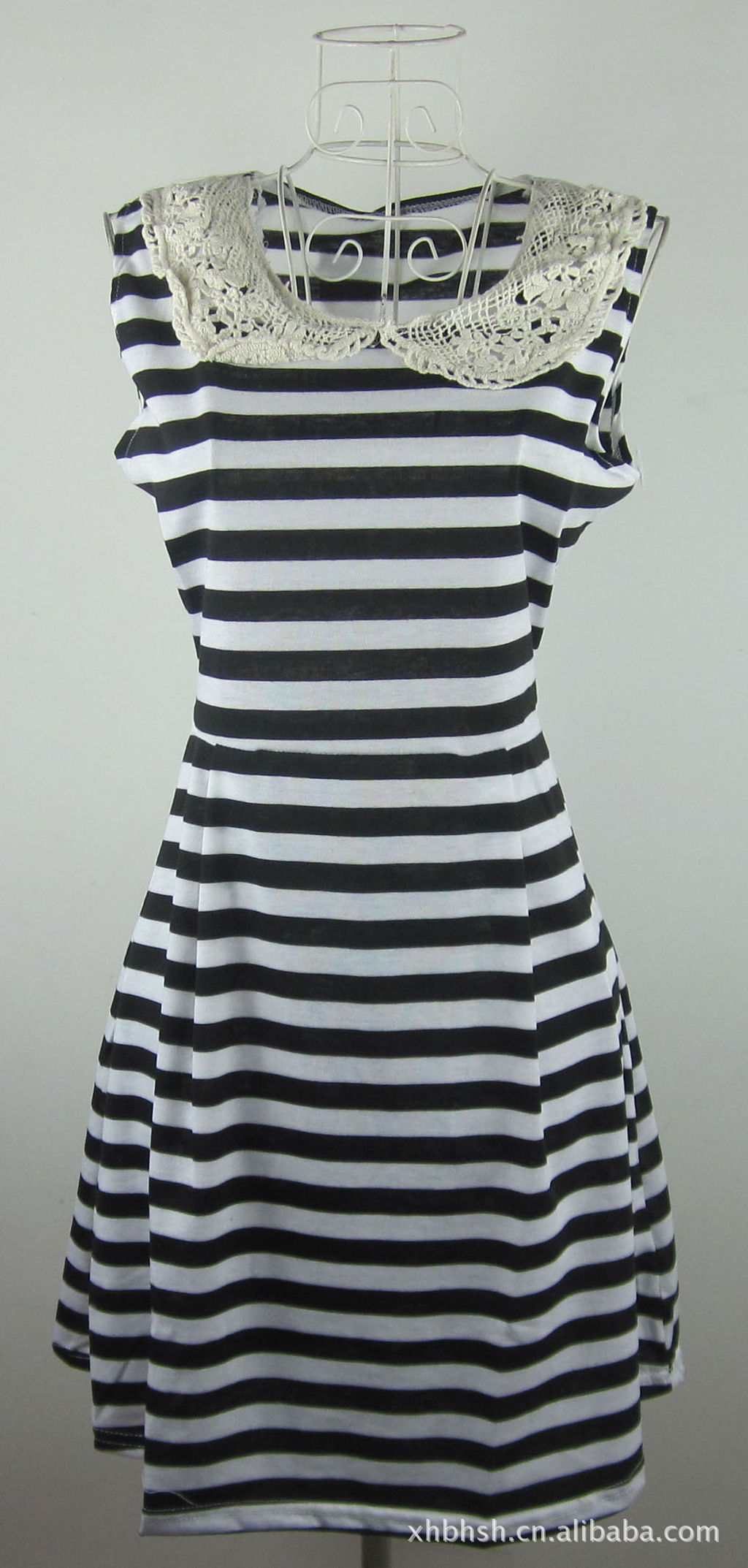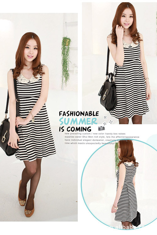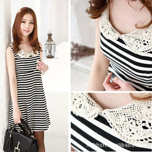 2012夏装新款钩织领伞状条纹修身优雅无袖连衣裙韩批发