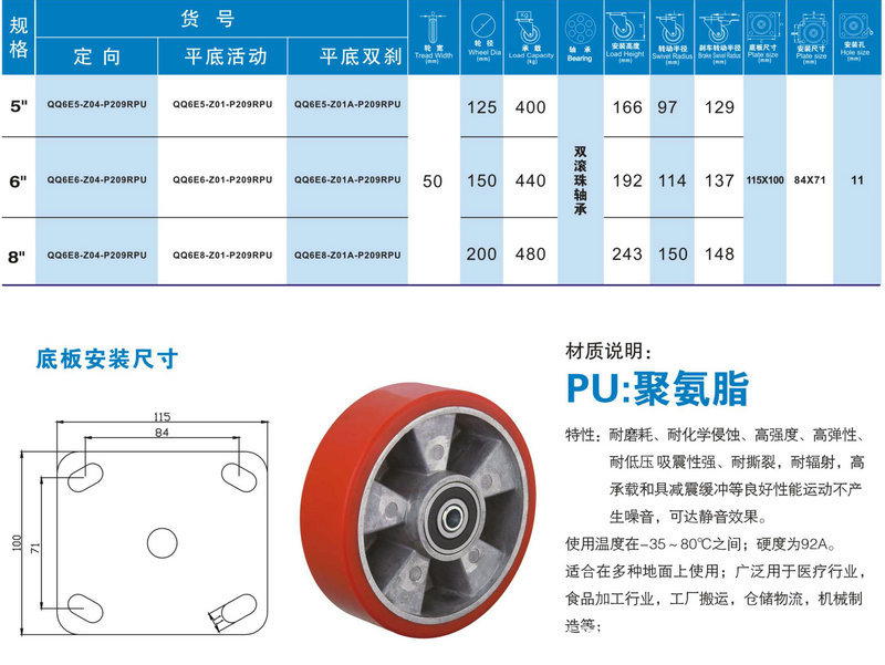 工业脚轮5寸,6寸,8寸重型万向轮,红色铝芯PU脚轮