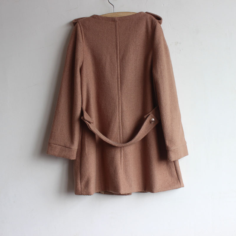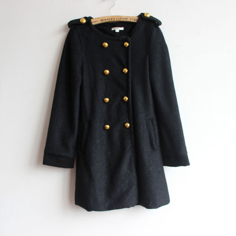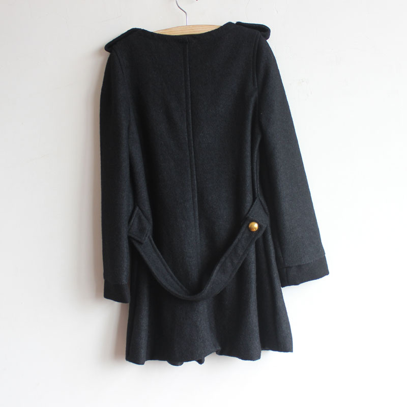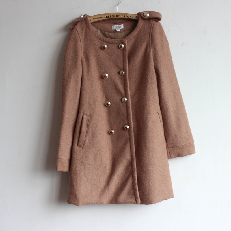 外贸原单秋冬款长袖圆领肩章装饰长款收腰双排扣毛呢大衣女外套