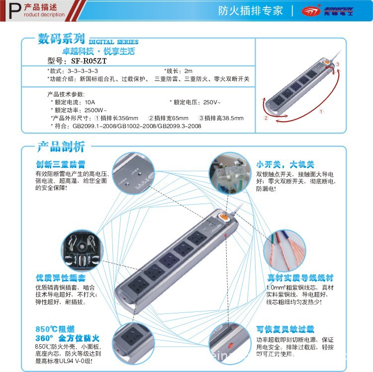 先锋插座数码系列 SF-R05ZT 5孔2.0米1.0mm 三重防雷 插排插板
