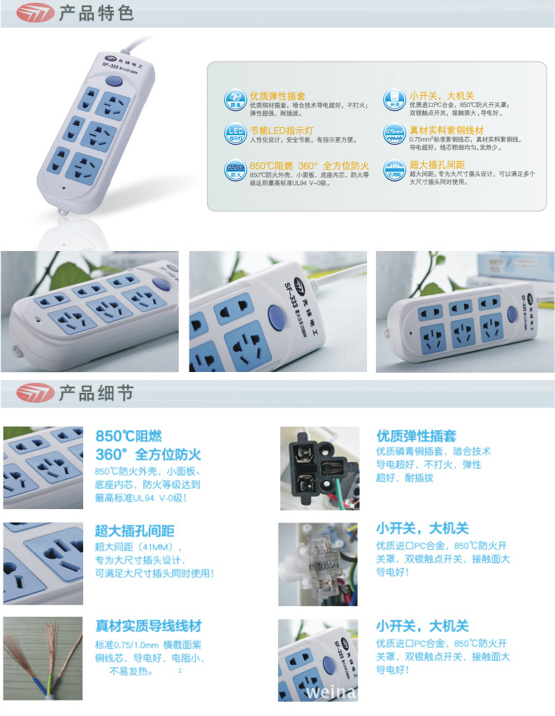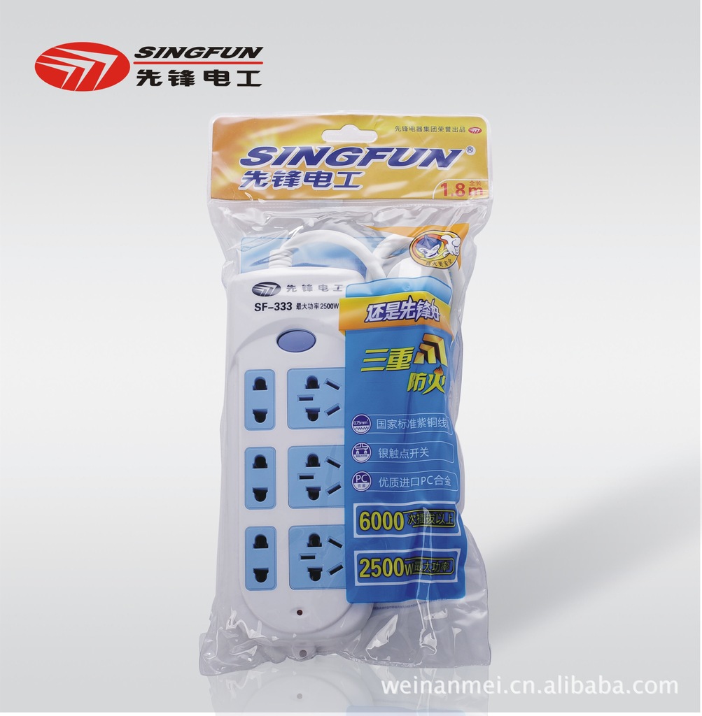 先锋插座 SF-333 6孔1.8米 新国标 三重防火 接线插排