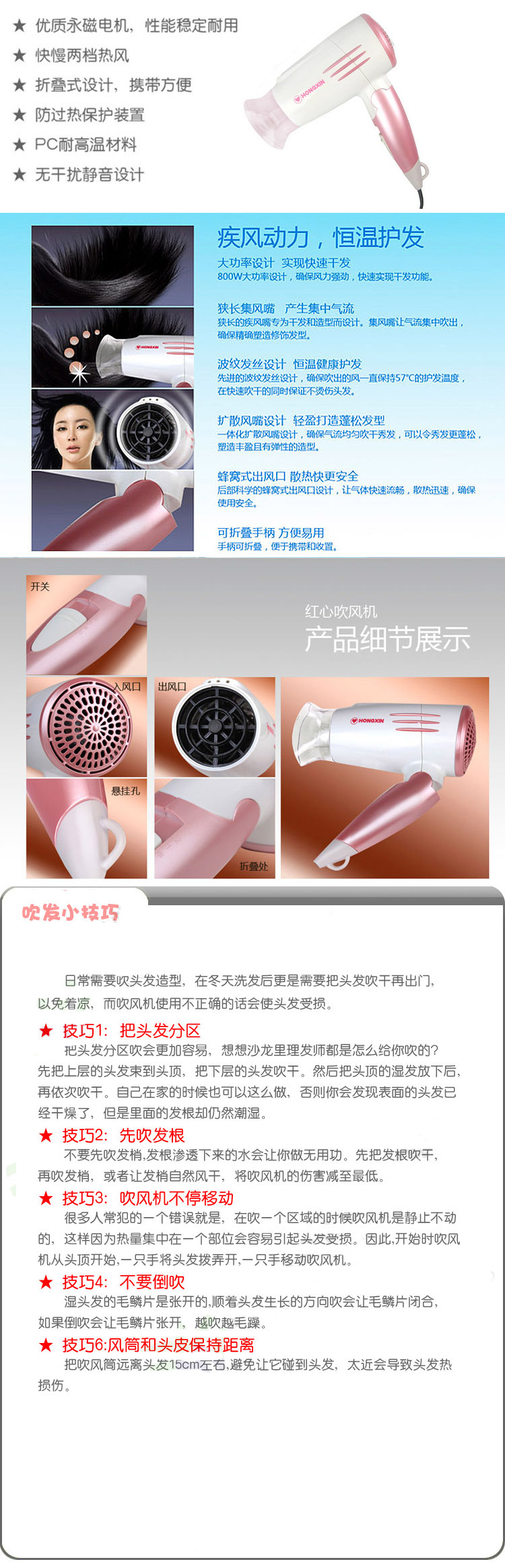 红心 电吹风 RH3378 正品 特价 折叠式无干扰设计 恒温负离子