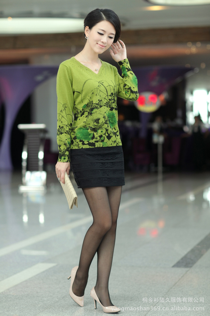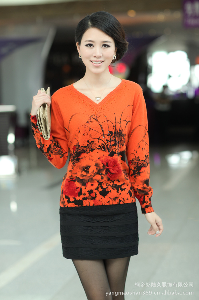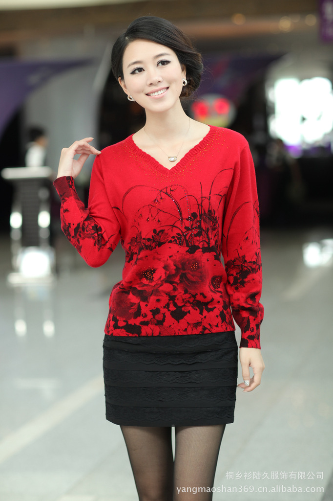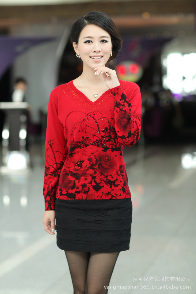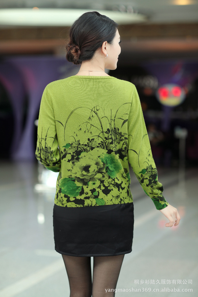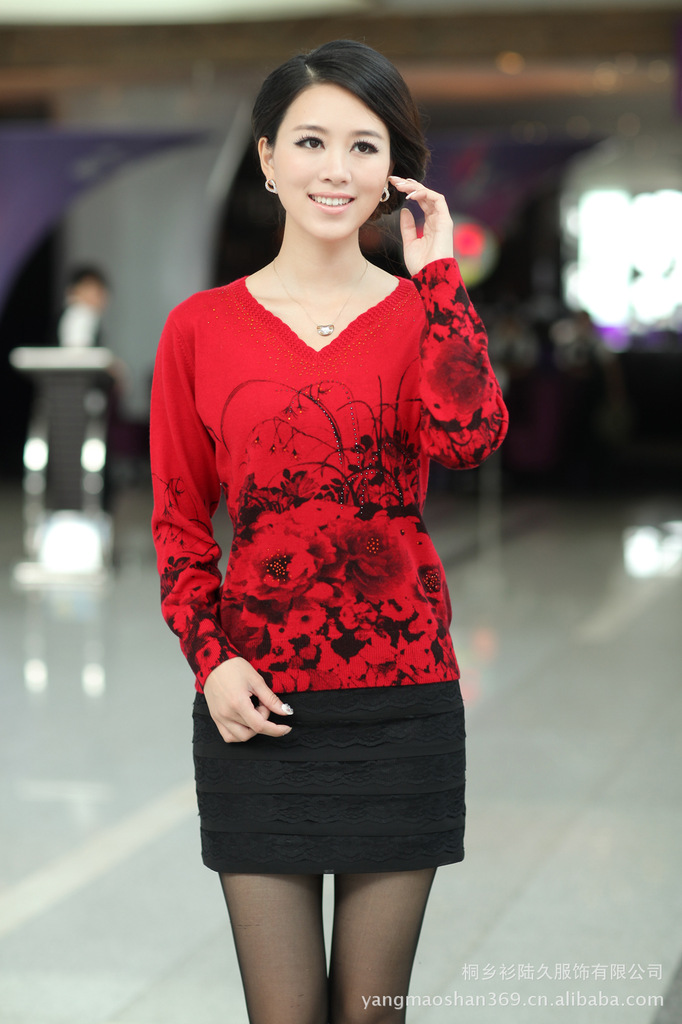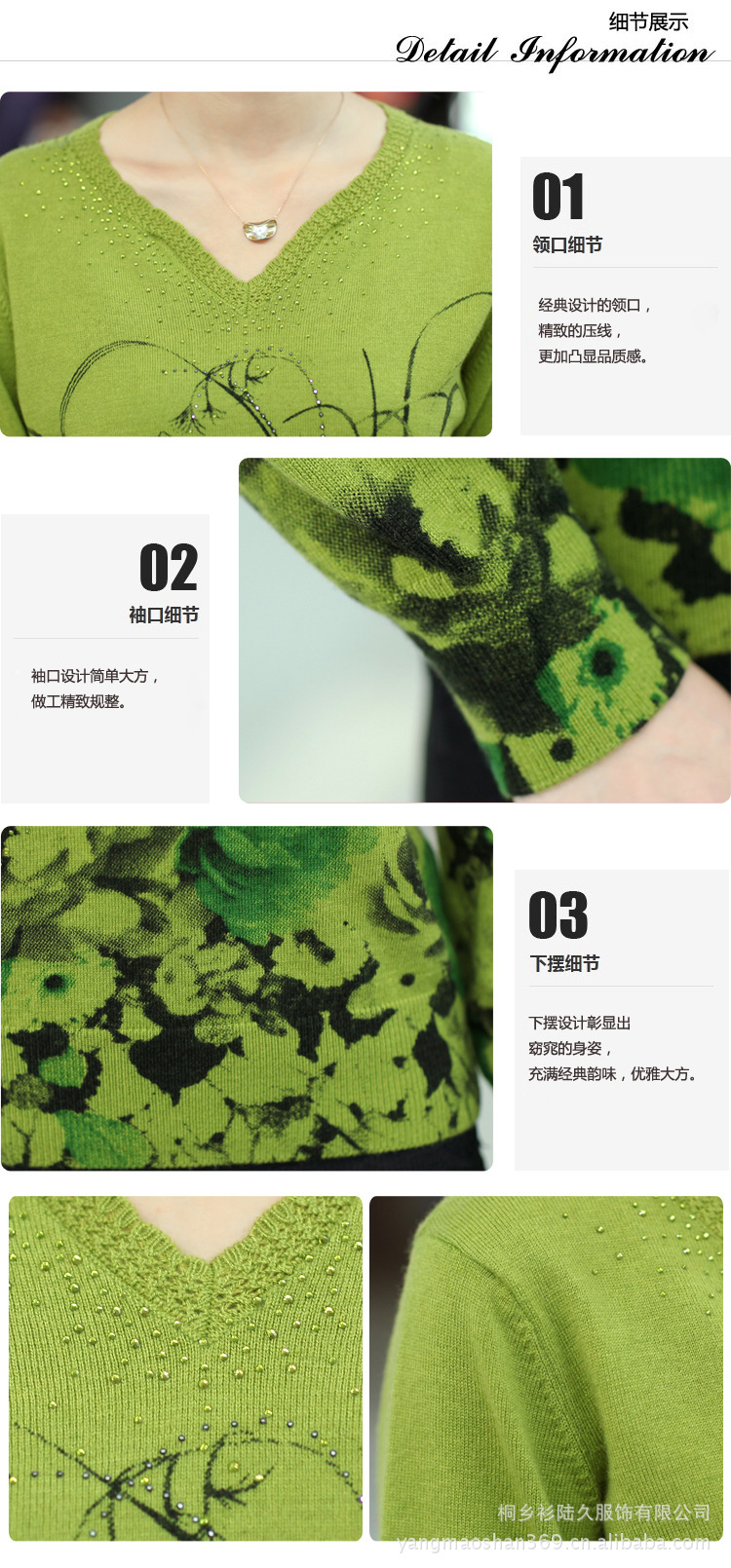 妈妈装 韩版高档印花针织衫 秋装新款套头V领毛衣 羊毛衫X-31