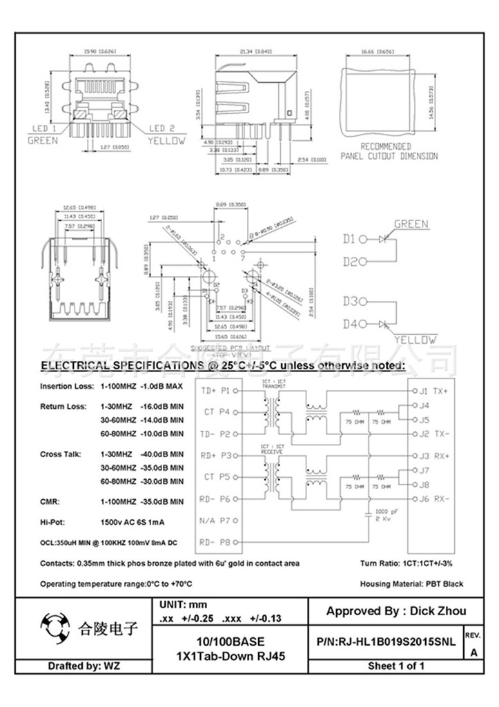 21.3mm单口滤波器RJ45变压器网络插座100M/1000Ml网络接口连接器