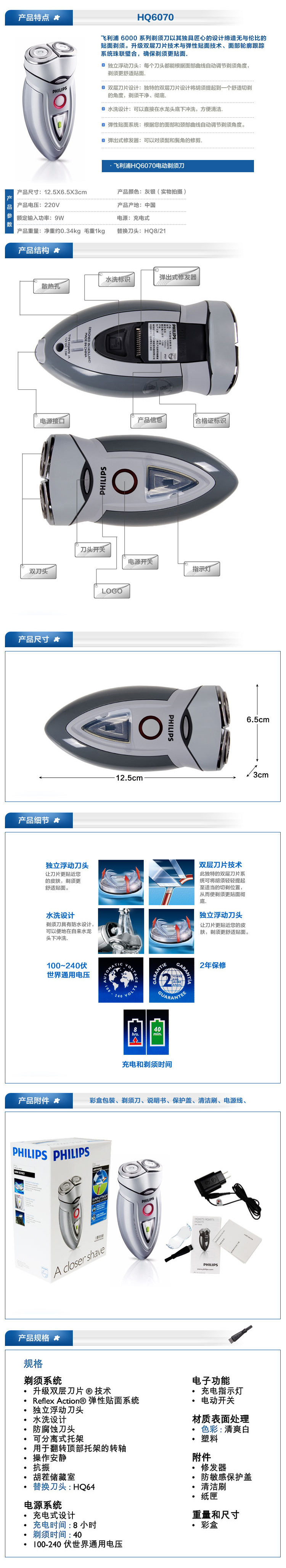 飞利浦 HQ6070剃须刀 充电水洗浮动双刀头 全国联保正品