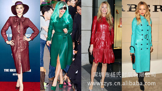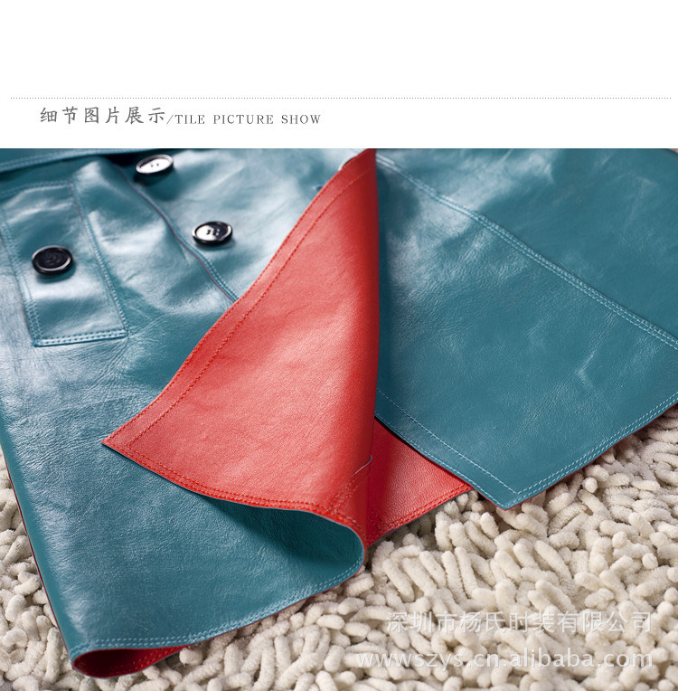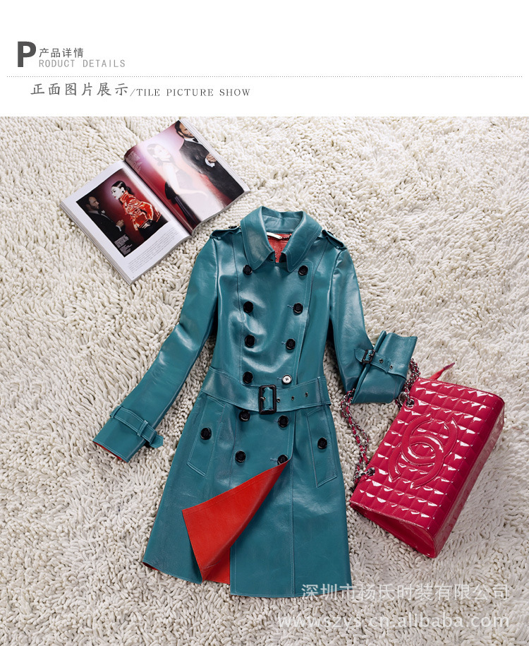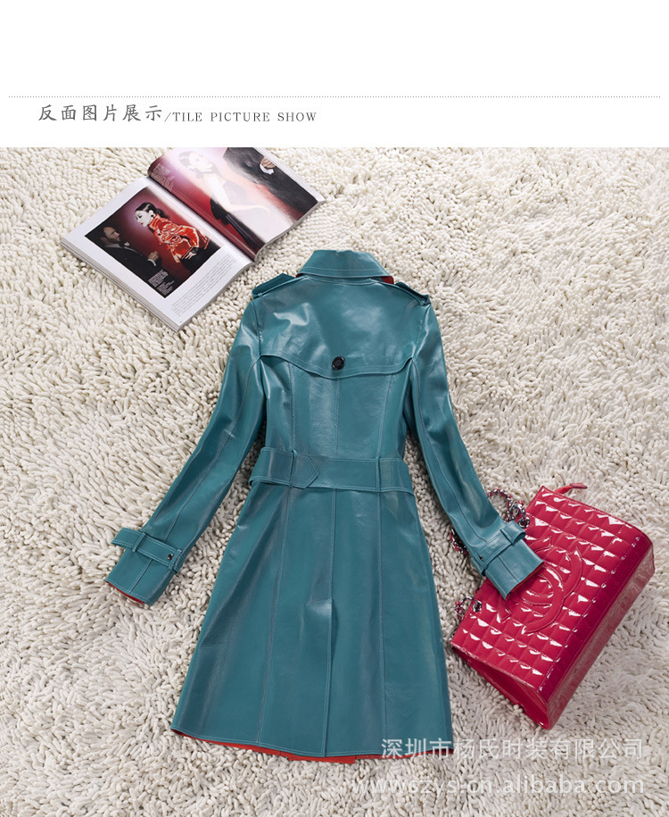 2012秋冬最新女装皮衣外套 明星同款双排扣配腰带中长款皮衣风衣