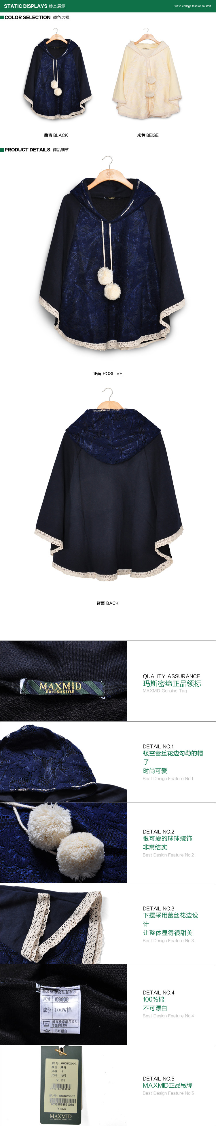 MAXMID英伦学院风女装连帽蕾丝花边女式衫外套批发00382003