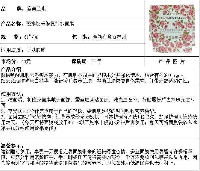 黛美兰琪蚕丝补水面膜 旗舰店