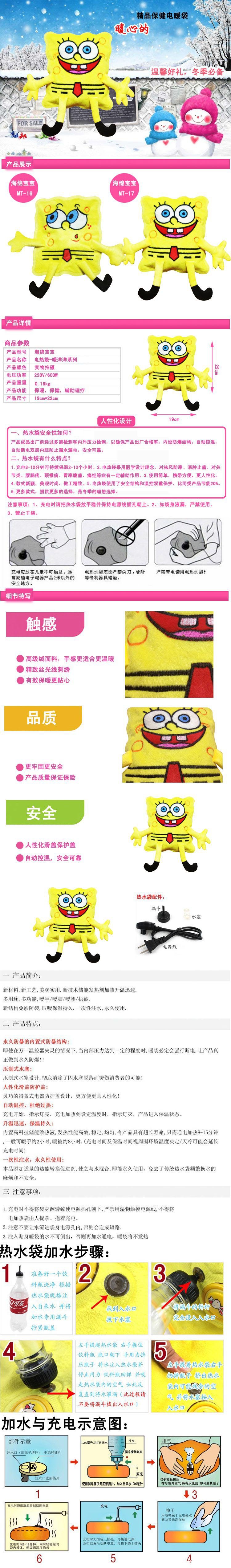 海绵宝宝绒面电热水袋 暖手宝 防爆暖水袋 电暖袋 电暖宝