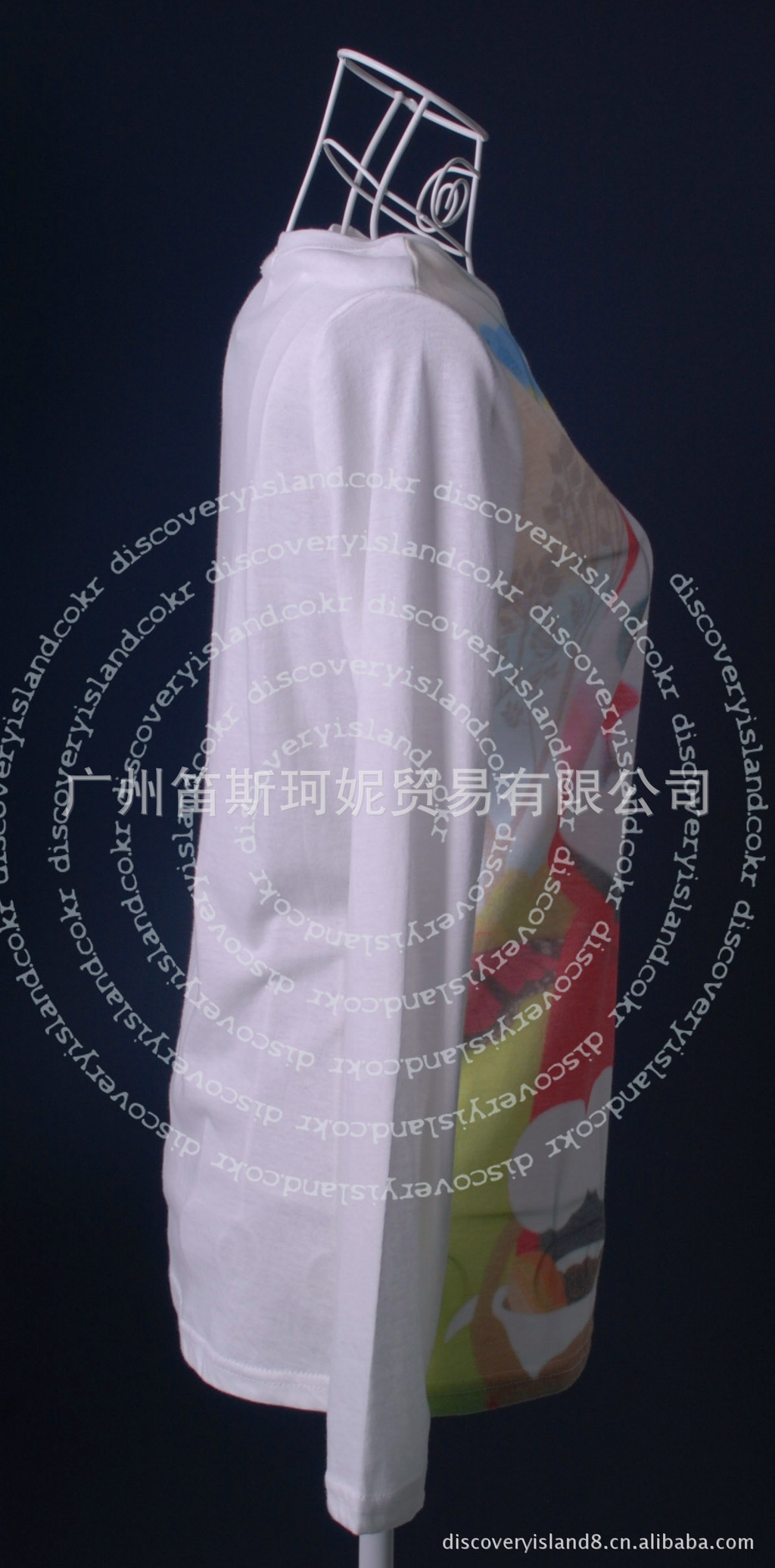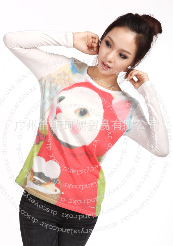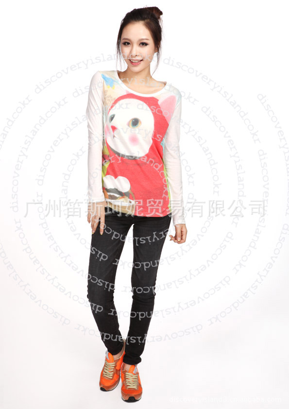 韩版春秋休闲 红色可爱大头猫 Discovery Island 烫画女装长袖T恤