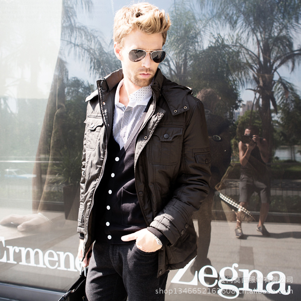 2012冬装新款外套 商务休闲可脱卸帽男士中长款外套 欧美男士棉衣