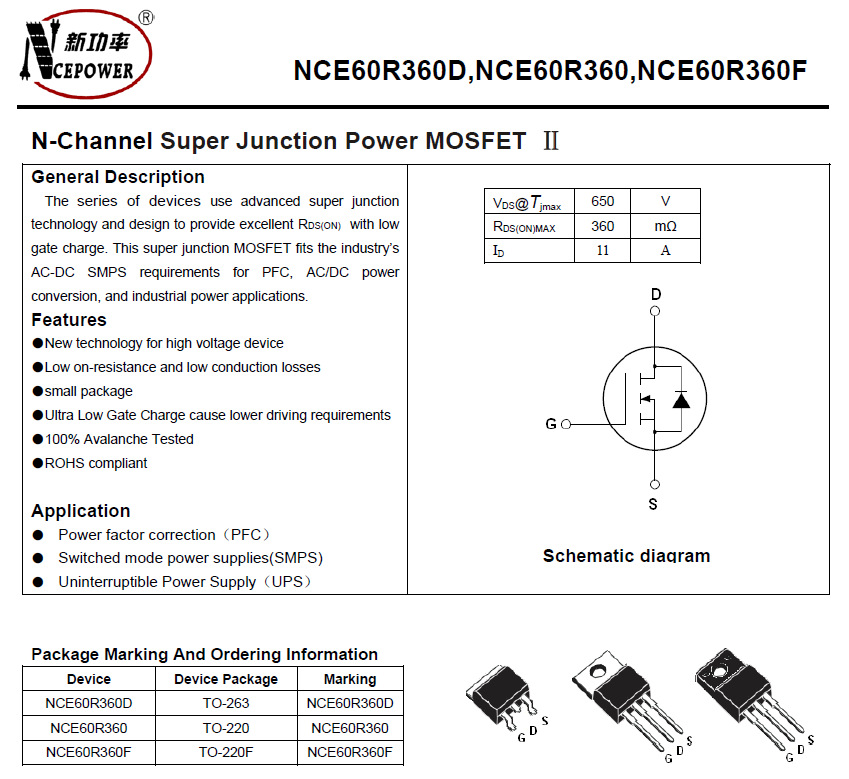 原厂供应超结MOS管NCE60R360D,NCE60R360,NCE60R360F/600V 11A