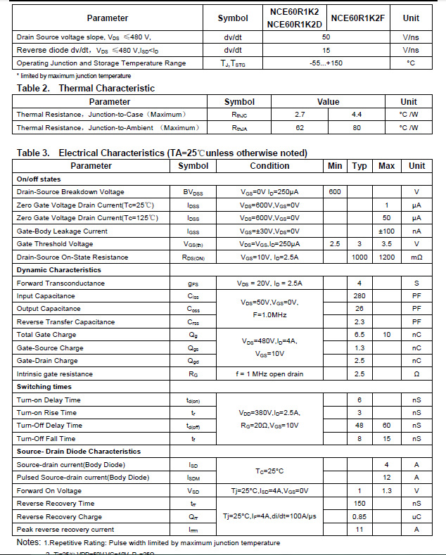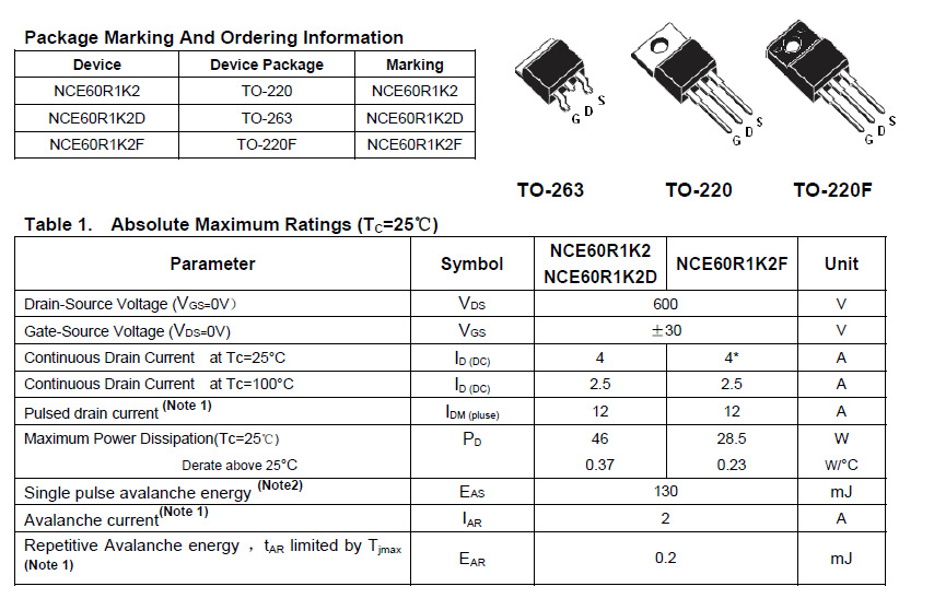 原厂供应超结MOS管NCE60R1K2,NCE60R1K2D,NCE60R1K2F /600V 4A