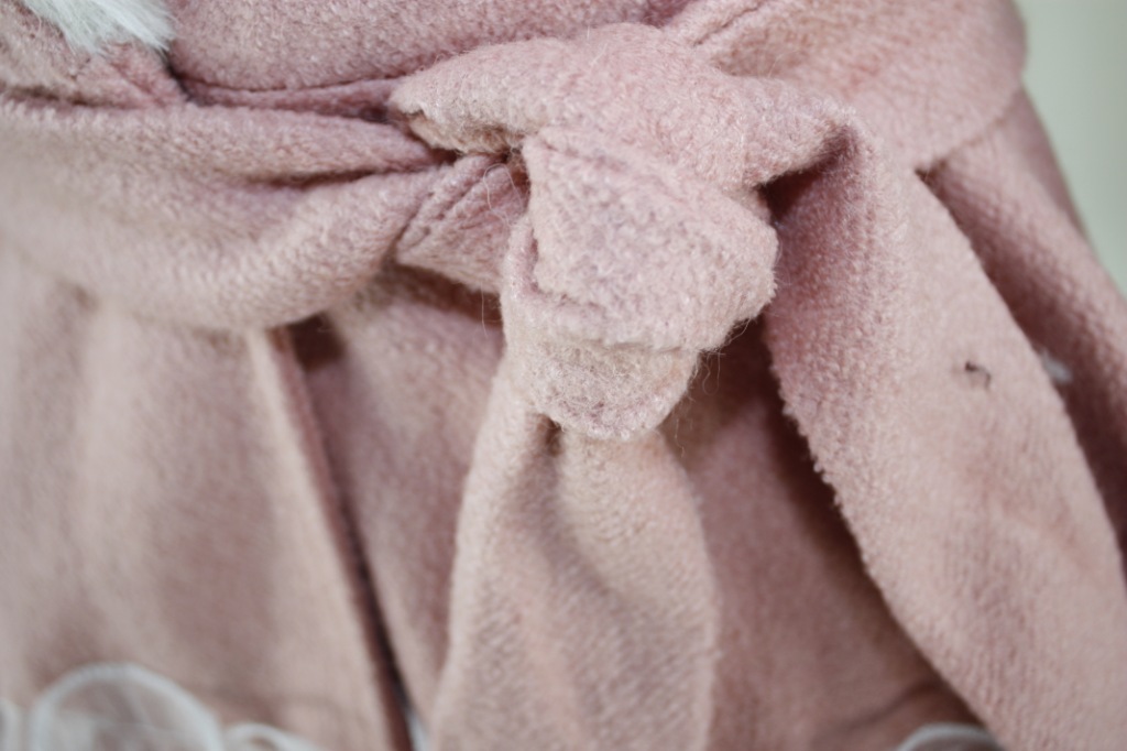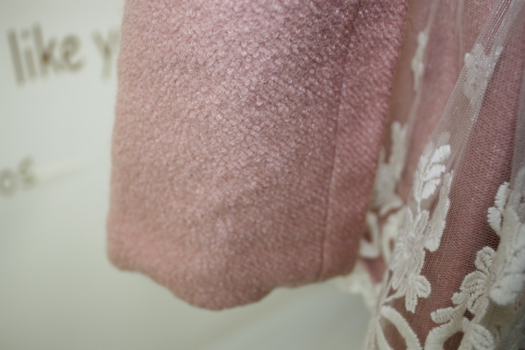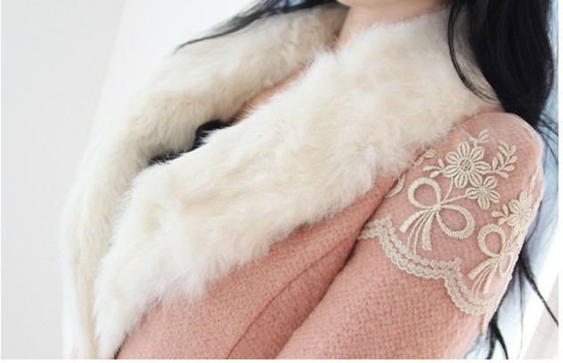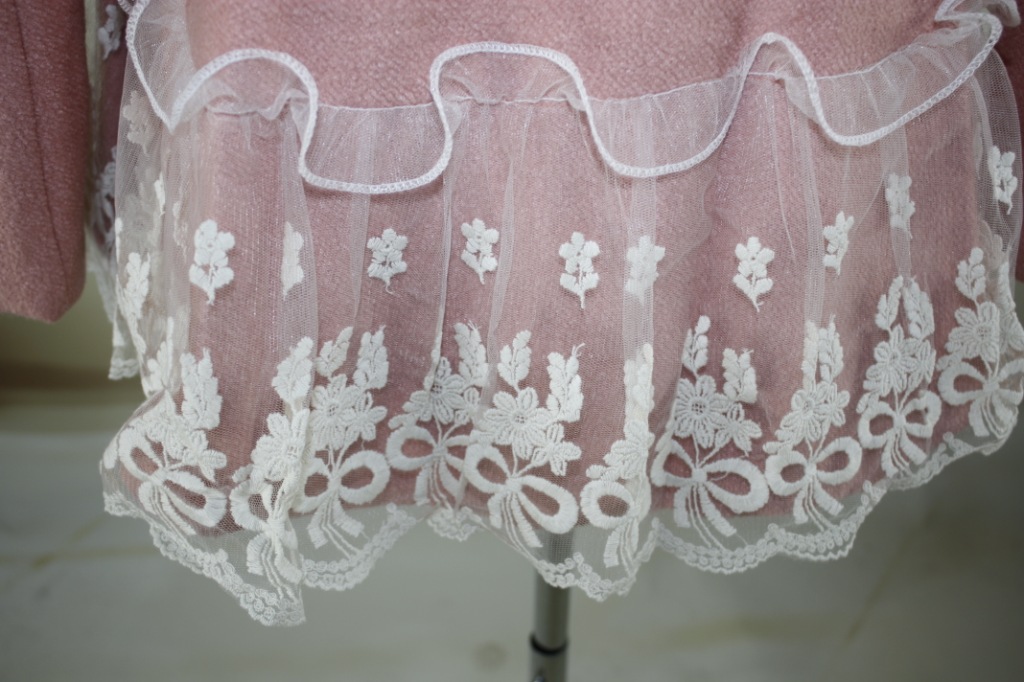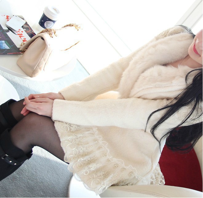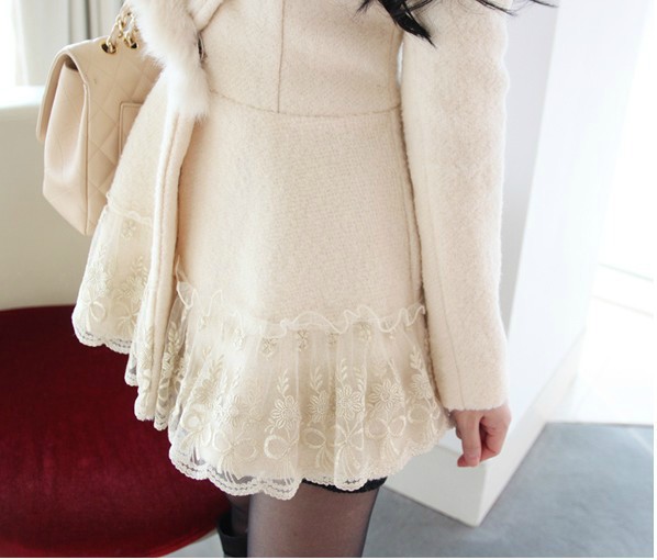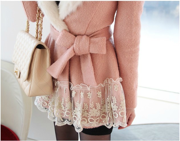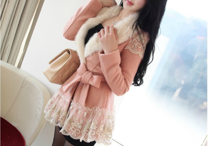 韩国女装冬装新款蕾丝钩花拼接蝴蝶结系带收腰毛呢外套ZA222